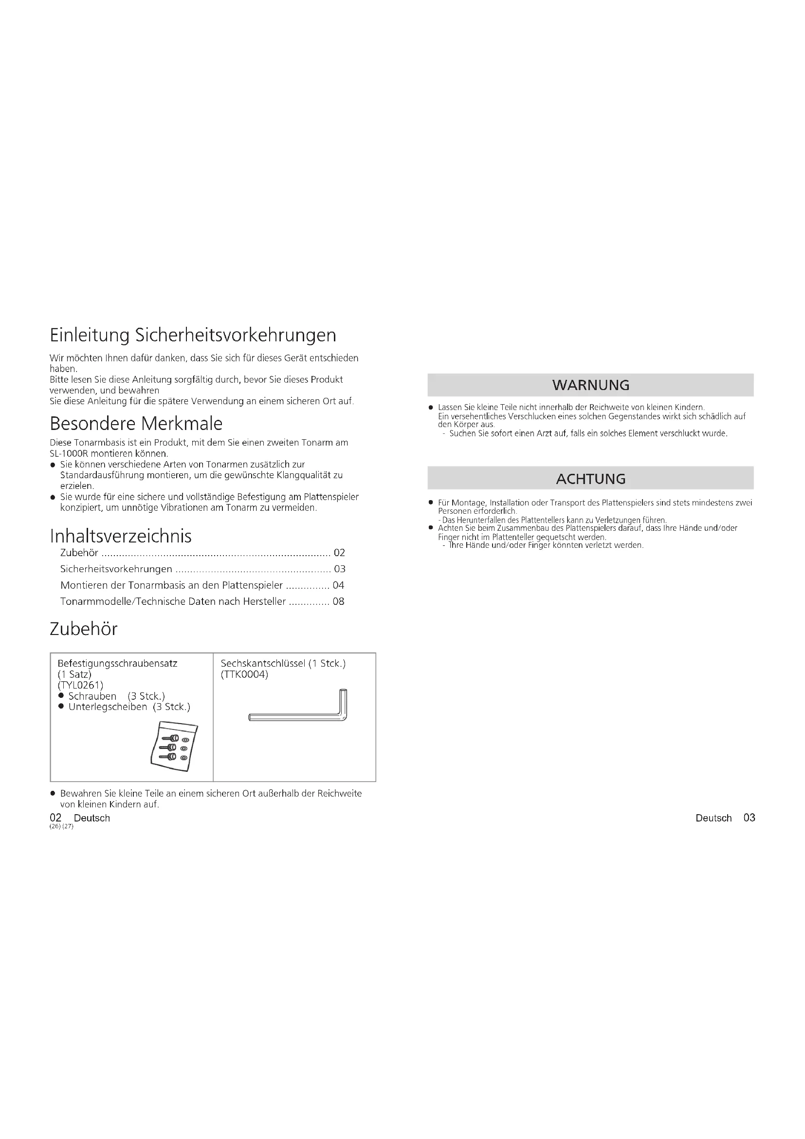 Achten Sie beim Zusammenbau des Plattenspielers darauf, dass Ihre Hände und/oder Finger nicht im Plattenteller gequetscht werden. - Ihre Hände und/oder Finger könnten verletzt werden. Besondere Merkmale Diese Tonarmbasis ist ein Produkt, mit dem Sie einen zweiten Tonarm am SL-1000R montieren können.