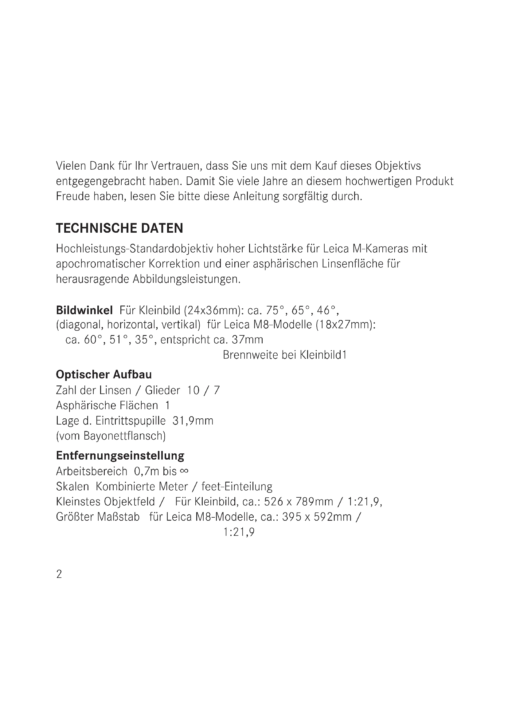 Deutsch..........................................................................................Seiten 2-11 English ......................................................................................... Pages 12-21 Français ....................................................................................... Pages 22-31 Nederlands ...............................................................................Pagina’s 32-41 Italiano ........................................................................................ Pagine 42-51 Españiol .....................................................................................Paginas 52-61 日本語 .................................................................................................... 62-71Vielen Dank für Ihr Vertrauen, dass Sie uns mit dem Kauf dieses Objektivs entgegengebracht haben. Damit Sie viele Jahre an diesem hochwertigen Produkt Freude haben, lesen Sie bitte diese Anleitung sorgfältig durch. TECHNISCHE DATEN Hochleistungs-Standardobjektiv hoher Lichtstärke für Leica M-Kameras mit apochromatischer Korrektion und einer asphärischen Linsenfläche für herausragende Abbildungsleistungen. Bildwinkel Für Kleinbild (24x36mm): ca. 75°, 65°, 46°, (diagonal, horizontal, vertikal) für Leica M8-Modelle (18x27mm): ca. 60°, 51°, 35°, entspricht ca. 37mm Brennweite bei Kleinbild1 Optischer Aufbau Zahl der Linsen / Glieder 10 / 7 Asphärische Flächen 1 Lage d. Eintrittspupille 31,9mm (vom Bayonettflansch) Entfernungseinstellung Arbeitsbereich 0,7m bis ∞ Skalen Kombinierte Meter / feet-Einteilung Kleinstes Objektfeld / Für Kleinbild, ca.: 526 x 789mm / 1:21,9, Größter Maßstab für Leica M8-Modelle, ca.: 395 x 592mm / 1:21,9 2Blende Einstellung / Funktionsweise Rastblende, auch halbe Werte einstellbar Kleinster Wert 16 Bajonett Leica M-Schnellwechsel-Bajonett mit 6 Bit Strichcode-Objektivkennung für digitale Leica M-Modelle