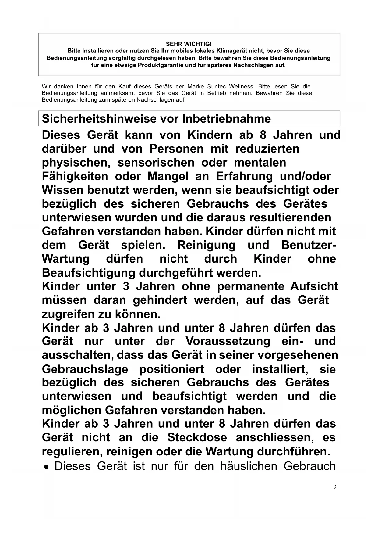Wir danken Ihnen für den Kauf dieses Geräts der Marke Suntec Wellness. Bitte lesen Sie die Bedienungsanleitung aufmerksam, bevor Sie das Gerät in Betrieb nehmen. Bewahren Sie diese Bedienungsanleitung zum späteren Nachschlagen auf. Sicherheitshinweise vor Inbetriebnahme Dieses Gerät kann von Kindern ab 8 Jahren und darüber und von Personen mit reduzierten physischen, sensorischen oder mentalen Fähigkeiten oder Mangel an Erfahrung und/oder Wissen benutzt werden, wenn sie beaufsichtigt oder bezüglich des sicheren Gebrauchs des Gerätes unterwiesen wurden und die daraus resultierenden Gefahren verstanden haben. Kinder dürfen nicht mit dem Gerät spielen. Reinigung und Benutzer- Wartung dürfen nicht durch Kinder ohne Beaufsichtigung durchgeführt werden. Kinder unter 3 Jahren ohne permanente Aufsicht müssen daran gehindert werden, auf das Gerät zugreifen zu können. Kinder ab 3 Jahren und unter 8 Jahren dürfen das Gerät nur unter der Voraussetzung ein- und ausschalten, dass das Gerät in seiner vorgesehenen Gebrauchslage positioniert oder installiert, sie bezüglich des sicheren Gebrauchs des Gerätes unterwiesen und beaufsichtigt werden und die möglichen Gefahren verstanden haben. Kinder ab 3 Jahren und unter 8 Jahren dürfen das Gerät nicht an die Steckdose anschliessen, es regulieren, reinigen oder die Wartung durchführen.