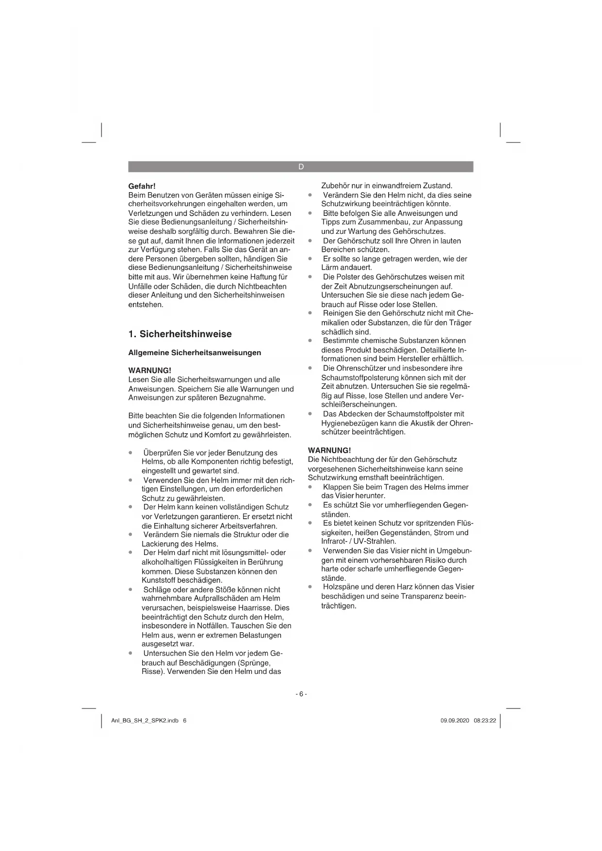 Holzspäne und deren Harz können das Visier beschädigen und seine Transparenz beein- trächtigen. Anl_BG_SH_2_SPK2.indb 6Anl_BG_SH_2_SPK2.indb 6 09.09.2020 08:23:2209.09.2020 08:23:22D