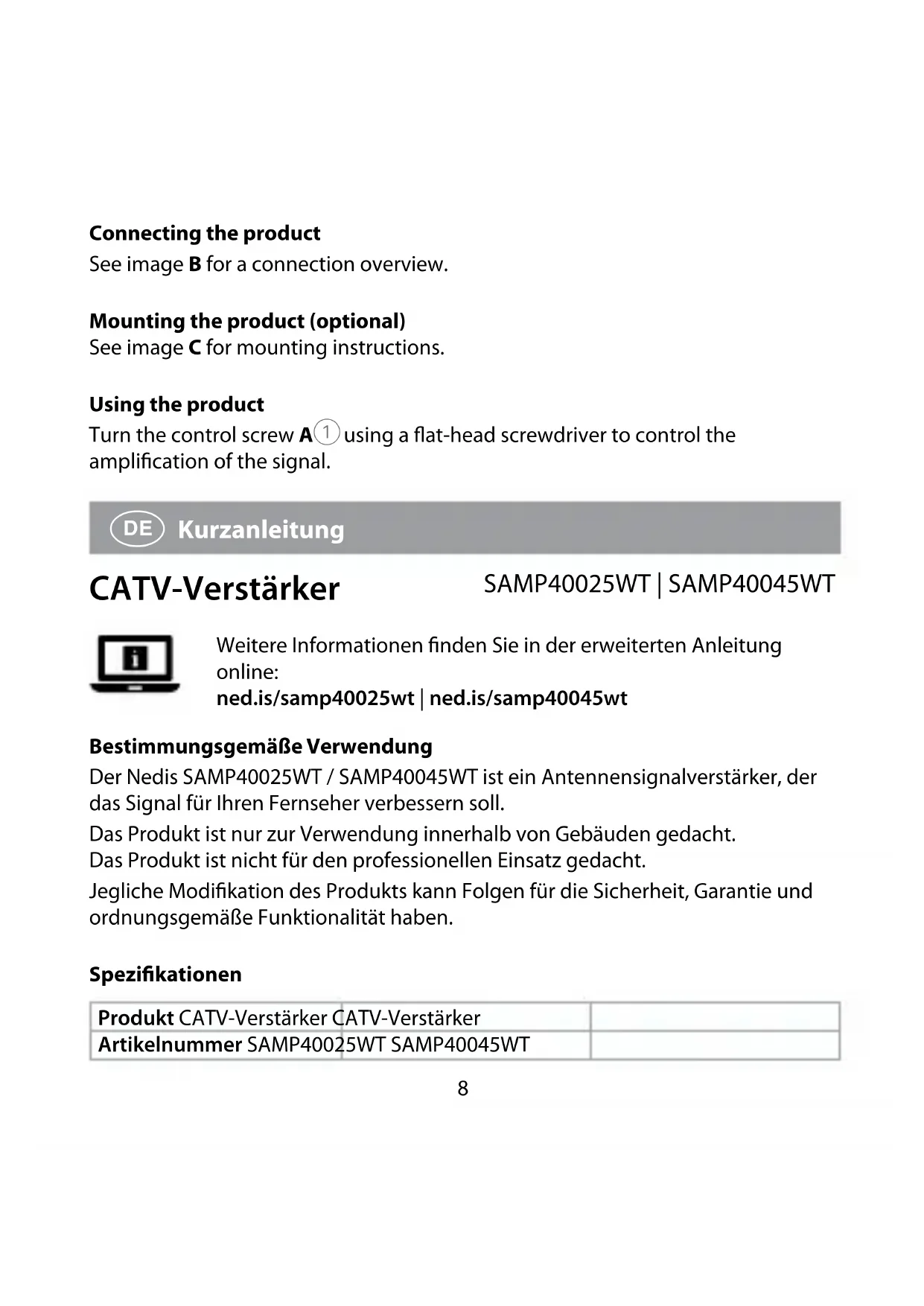 Weitere Informationen nden Sie in der erweiterten Anleitung online: ned.is/samp40025wt | ned.is/samp40045wt Bestimmungsgemäße Verwendung Der Nedis SAMP40025WT / SAMP40045WT ist ein Antennensignalverstärker, der das Signal für Ihren Fernseher verbessern soll. Das Produkt ist nur zur Verwendung innerhalb von Gebäuden gedacht. Das Produkt ist nicht für den professionellen Einsatz gedacht. Jegliche Modikation des Produkts kann Folgen für die Sicherheit, Garantie und ordnungsgemäße Funktionalität haben. Spezikationen Produkt CATV-Verstärker CATV-Verstärker Artikelnummer SAMP40025WT SAMP40045WT9 Größe (L x B x H) 66 x 57,2 x 28 mm 102 x 57,2 x 28 mm Frequenzbereich 50 - 694 MHz 50 - 694 MHz Verstärkung 15 typ. 11,5 dB min. 10 typ. 6,5 dB min. Verstärkungskontrolle 12 dB min. 12 dB min. Eingangs- Rückussdämpfung 8 typ. 5 dB min. 8 typ. 5 dB min. Ausgangs- Rückussdämpfung 8 typ. 5 dB min. 8 typ. 5 dB min. Rauschzahl 5 typ. 8 dB min. 5 typ. 8 dB min. Ausgangspegel 85 dBµV min. 80 dBµV min. Impedanz 75 Ω 75 Ω Eingangsanschluss IEC-Buchse x1 IEC-Buchse x1 Ausgangsanschluss IEC-Stecker x2 IEC-Stecker x4 Netzteil Eingang 100 - 240 VAC ; 50 / 60 Hz ; 0,15 A