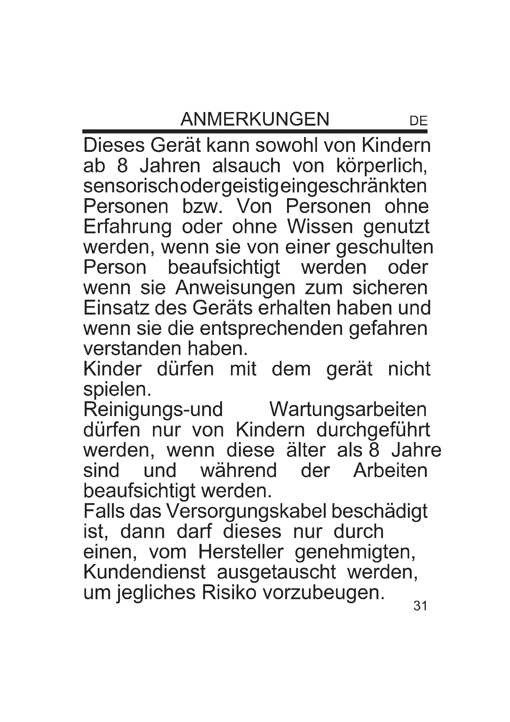 INFORMATION UTILISATEUR « Mise en oeuvre de la directive 2012/19/UE sur les déchets d’équipements électriques et électroniques (DEEE) », relative à la réduction de l’utilisation de substances dangereuses dans les appareils électriques et électroniques, ainsi qu’à l’élimination des déchets. Le symbole de la poubelle sur roulettes barrée sur l’appareil ou sur son emballage indique que le produit doit être éliminé séparément des autres déchets à la n de sa durée de vie. L’utilisateur doit donc apporter l’appareil à jeter à des centres de collecte séparés appropriés pour les déchets électriques et électroniques. Pour plus de détails, veuillez contacter l’autorité locale spéciale. Une collecte séparée appropriée de l’appareil pour un recyclage, un traitement ou une élimination respectueux de l’environnement permet d’éviter les dommages à l’environnement et à la santé humaine et encourage la réutilisation et/ou le recyclage des matériaux qui composent l’appareil. L’élimination abusive du produit par l’utilisateur entraînera l’application d’amendes administratives conformément aux lois en vigueur. Élimination30 GARANTIE Conditions La garantie a une durée de 24 mois à compter de la date d’achat. Cette garantie est valable seulement si correctement compilée et accompagnée du ticket de caisse qui conrme la date d’achat. L’appareil doit être remis exclusivement à notre SAV agréé. La garantie couvre la substitution ou la réparation des composants de l’appareil défectueux à l’origine à cause de vices de fabrication. Nous garantissons toute de même l’assistance (payante) même des produits hors garantie. Le consommateur est titulaire des droits applicables par la législation nationale disciplinant la vente de biens de consommations ; cette garantie ne compromet pas les droits en question. Le fabricant décline toute responsabilité pour les éventuels dommages physiques ou matériels dérivant de l’utilisation impropre de l’appareil et du non-respect des consignes indiquées dans le manuel. Limitations Tous les droits de garantie et toutes nos responsabilités déchoient si l’appareil a été : -modié de la part de personnel non autorisé. -utilisé, conservé ou transporté de façon impropre. La garantie ne couvre pas les pertes de prestations esthétiques ou celles qui ne compromettent pas l’origine des fonctions. Si malgré l’attention dédiée au choix des composants et l’engagement dans la réalisation du produit que vous venez d’acheter vous remarquez des défauts ou si vous avez besoin d’informations, veuillez vous adresser au revendeur de zone.31 Dieses Gerät kann sowohl von Kindern ab 8 Jahren alsauch von körperlich, sensorisch oder geistig eingeschränkten Personen bzw. Von Personen ohne Erfahrung oder ohne Wissen genutzt werden, wenn sie von einer geschulten Person beaufsichtigt werden oder wenn sie Anweisungen zum sicheren Einsatz des Geräts erhalten haben und wenn sie die entsprechenden gefahren verstanden haben. Kinder dürfen mit dem gerät nicht spielen. Reinigungs-und Wartungsarbeiten dürfen nur von Kindern durchgeführt werden, wenn diese älter als 8 Jahre sind und während der Arbeiten beaufsichtigt werden. Falls das Versorgungskabel beschädigt ist, dann darf dieses nur durch einen, vom Hersteller genehmigten, Kundendienst ausgetauscht werden, um jegliches Risiko vorzubeugen. ANMERKUNGEN DE32 Das Gerät nicht an die Stromversorgung anschließen und verwenden Sie es nicht sei denn, es ist komplett montiert (siehe Montageanleitung). Gerät vor dem Entfernen oder Anbringen des Schutzgitters durch Herausziehen des Netzsteckers vom Netz trennen. Garantiebescheinigung, skalische Quittung und Bedienungsanleitung für jede spätere Konsultation bitte aufbewahren. Nach Entfernen der Verpackung vergewissere man sich der Integrität des Gerätes und sollte man bei dieser Überprüfung sichtbare Beschädigungen festestellen, das Gerät nicht benutzen und sich direkt an qualiziertes Fachpersonal wenden. Keinerlei Verpackungsteile für Kinder zugänglich zurücklassen, das Gerät auch nicht als ein Spielzeug verwenden: es ist ein Elektrogerät und als solches zu behandeln. Bevor man das Gerät an die Netzspannung anschließt, stelle man sicher daß die an der Steckdose liegende Spannung auch derjenigen des Typenschildes des Gerätes entspricht. Die Sicherheit dieses Gerätes ist nur dann gewährleistet wenn das Gerät auch an eine leistungsfähige Erdungsanlage angeschlossen ist. Sollten Stecker und Steckdose nicht kompatibel sein, so lasse man die Steckdose durch eine passende Steckdose ersetzen. Diese Arbeit ist von einem qualizierten Fachmann durchzuführen. Keine Adapter oder Verlängerungsschnuren verwenden die nicht den Forderungen der gegenwärtig geltenden Sicherheitsnormen genügen oder die die Stromgrenzwerte überschreiten. Trennen Sie das Gerät vom Stromnetz, wenn es nicht verwendet wird. Am Netzkabel oder am Gerät selbst nicht ziehen um Stecker aus der Steckdose herauszuziehen. Der Gebrauch irgendeines Elektrogerätes erfordert immer die Beachtung einiger grundlegenden Regeln und zwar insbesondere: - Man darf niemals das Gerät mit nassen oder feuchten Händen berühren. - Das Gerät niemals barfuß benutzen. - Das Gerät nicht den Witterungseinüssen ausgesetzt lassen (Regen, Sonnenstrahlung). - Gerät nicht Schlag-oder Stoßbeanspruchungen aussetzen.33 Es ist zu empfehlen, das Netzkabel für seine ganze Länge abzuwickeln um somit eventuelle Überhitzungen zu vermeiden. Sollte man sich dafür entscheiden diesen Gerätetyp nicht mehr zu benutzen, so ist es angebracht das Gerät unbenutzbar zu machen durch Abschneiden des Netzkabels, natürlich nach dessen Abtrennung von der Steckdose. Bei Erscheinen einer Störung bzw. einem nicht einwandfreien Betrieb des Gerätes hat man sofort den Stecker zu ziehen, keinerlei Eingri am Gerät vorzunehmen und sich an