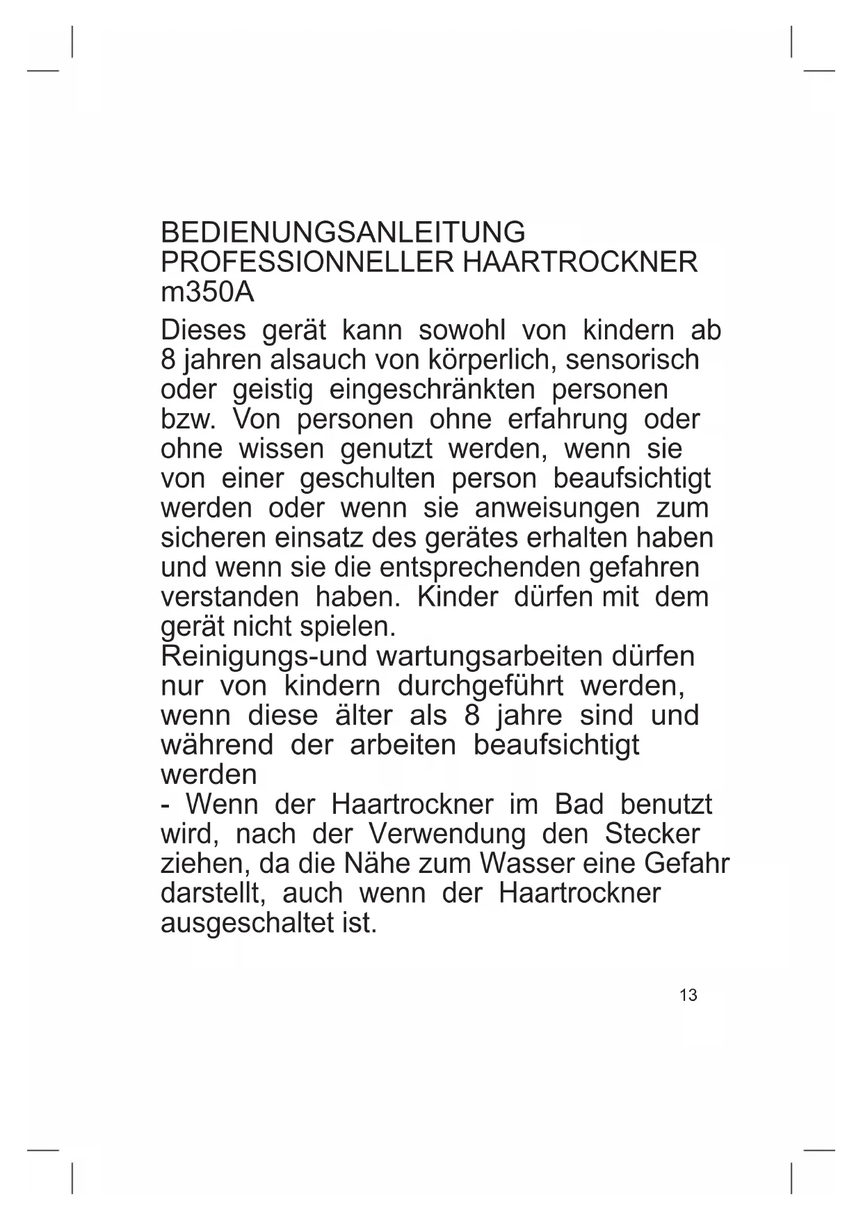 BEDIENUNGSANLEITUNG PROFESSIONNELLER HAARTROCKNER m350A Dieses gerät kann sowohl von kindern ab 8 jahren alsauch von körperlich, sensorisch oder geistig eingeschränkten personen bzw. Von personen ohne erfahrung oder ohne wissen genutzt werden, wenn sie von einer geschulten person beaufsichtigt werden oder wenn sie anweisungen zum sicheren einsatz des gerätes erhalten haben und wenn sie die entsprechenden gefahren verstanden haben. Kinder dürfen mit dem gerät nicht spielen. Reinigungs-und wartungsarbeiten dürfen nur von kindern durchgeführt werden, wenn diese älter als 8 jahre sind und während der arbeiten beaufsichtigt werden - Wenn der Haartrockner im Bad benutzt wird, nach der Verwendung den Stecker ziehen, da die Nähe zum Wasser eine Gefahr darstellt, auch wenn der Haartrockner ausgeschaltet ist.14 - Um einen besseren Schutz zu gewährleisten, wird empfohlen im elektrischen Schaltkreis, der das Badezimmer speist, eine Dierentialstromvorrichtung vorzusehen, deren Nenndierentialstrom beim Betrieb nicht höher als 30mA ist. Fragen Sie bei Ihrem Installateur diesbezüglich um Rat an. Nicht in der Badewanne und in der Dusche benutzen. ACTHUNG: Das Gerät nicht in der Nähe von Badewanne, Becken und Behälter mit Wasser benutzen. Sollte das Netzkabel beschädigt sein, so darf er nur in vom Hersteller dazu ermächtigen Service-Centern ausgetauscht werden.15 Anmerkungen