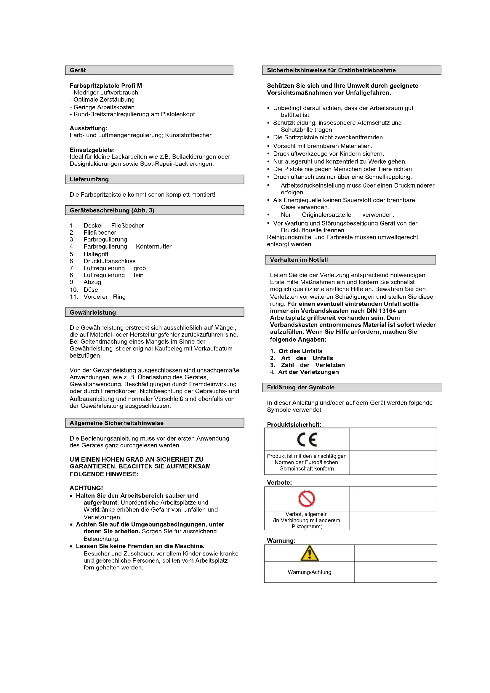Sicherheitshinweise für Erstinbetriebnahme Schützen Sie sich und Ihre Umwelt durch geeignete Vorsichtsmaßnahmen vor Unfallgefahren. Unbedingt darauf achten, dass der Arbeitsraum gut belüftet ist. Schutzkleidung, insbesondere Atemschutz und Schutzbrille tragen. Die Spritzpistole nicht zweckentfremden. Vorsicht mit brennbaren Materialien. Druckluftwerkzeuge vor Kindern sichern. Nur ausgeruht und konzentriert zu Werke gehen. Die Pistole nie gegen Menschen oder Tiere richten. Druckluftanschluss nur über eine Schnellkupplung. Arbeitsdruckeinstellung muss über einen Druckminderer erfolgen. Als Energiequelle keinen Sauerstoff oder brennbare Gase verwenden. Nur Originalersatzteile verwenden. Vor Wartung und Störungsbeseitigung Gerät von der Druckluftquelle trennen. Reinigungsmittel und Farbreste müssen umweltgerecht entsorgt werden. Verhalten im Notfall Leiten Sie die der Verletzung entsprechend notwendigen Erste Hilfe Maßnahmen ein und fordern Sie schnellst möglich qualifizierte ärztliche Hilfe an. Bewahren Sie den Verletzten vor weiteren Schädigungen und stellen Sie diesen ruhig. Für einen eventuell eintretenden Unfall sollte immer ein Verbandskasten nach DIN 13164 am Arbeitsplatz griffbereit vorhanden sein. Dem Verbandskasten entnommenes Material ist sofort wieder aufzufüllen. Wenn Sie Hilfe anfordern, machen Sie folgende Angaben: