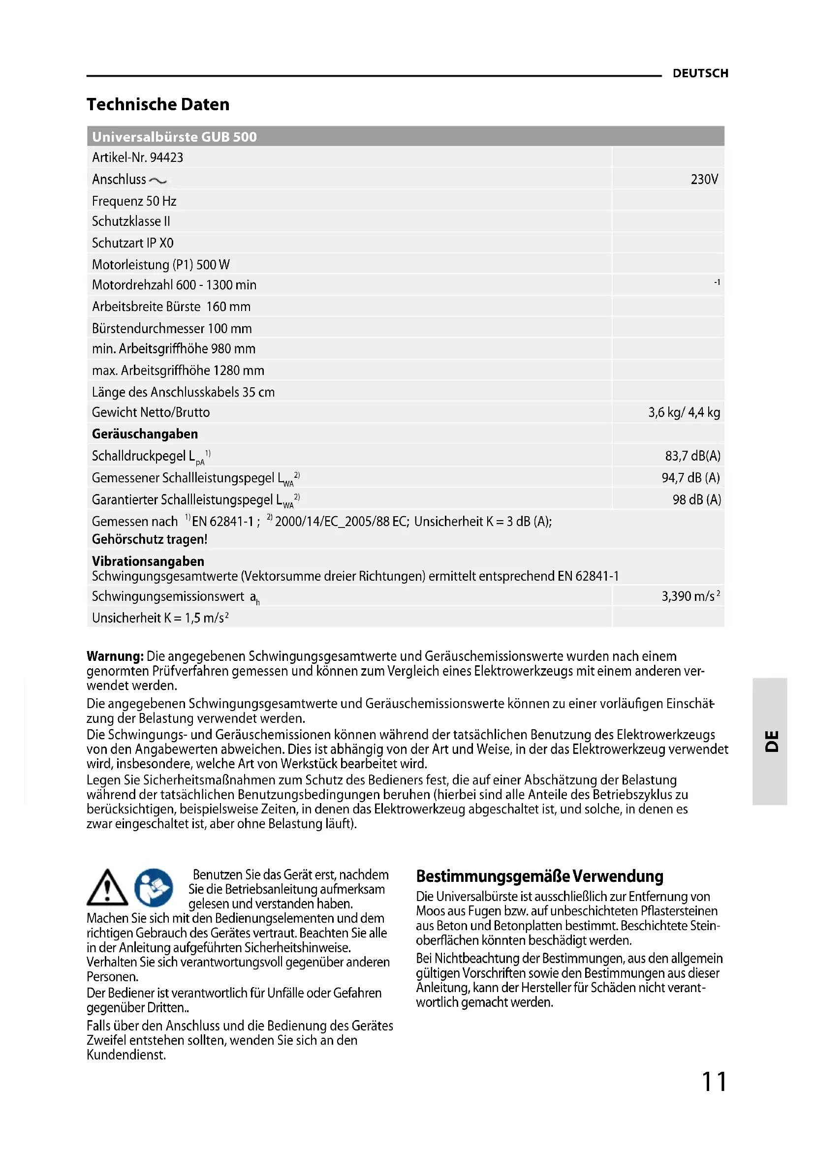 DEUTSCH Technische Daten Universalbürste GUB 500 Artikel-Nr. 94423 Anschluss 230 V Frequenz 50 Hz Schutzklasse II Schutzart IP X0 Motorleistung (P1) 500 W Motordrehzahl 600 - 1300 min