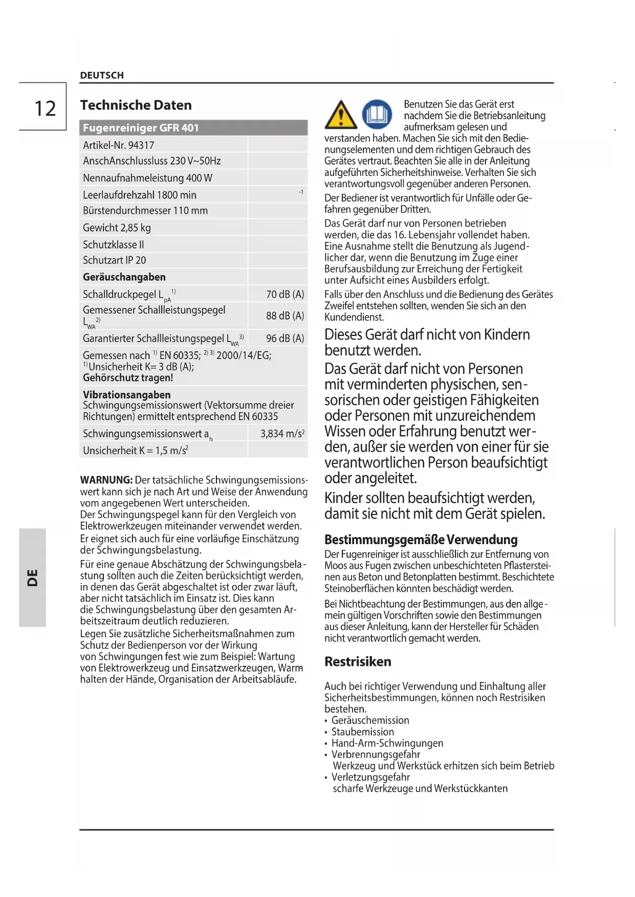 Technische Daten Fugenreiniger GFR 401 Artikel-Nr. 94317 AnschAnschlussluss 230 V~50Hz Nennaufnahmeleistung 400 W Leerlaufdrehzahl 1800 min