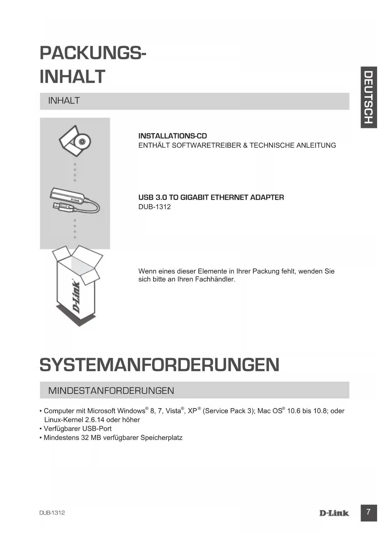 USB 3.0 TO GIGABIT EThErNET ADAPTEr DUB-1312 INHALT Wenn eines dieser Elemente in Ihrer Packung fehlt, wenden Sie sich bitte an Ihren Fachhändler. SYSTEMANFOrDErUNGEN