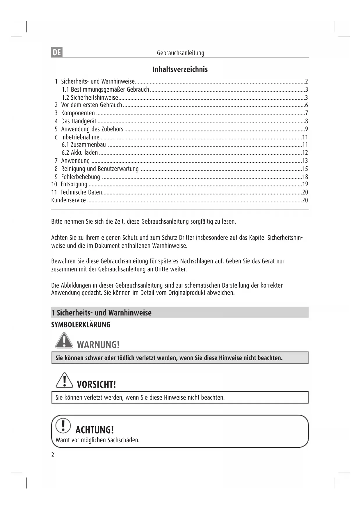 - Kundenservice Inhaltsverzeichnis Bitte nehmen Sie sich die Zeit, diese Gebrauchsanleitung sorgfältig zu lesen. Achten Sie zu Ihrem eigenen Schutz und zum Schutz Dritter insbesondere auf das Kapitel Sicherheitshin- weise und die im Dokument enthaltenen Warnhinweise. Bewahren Sie diese Gebrauchsanleitung für späteres Nachschlagen auf. Geben Sie das Gerät nur zusammen mit der Gebrauchsanleitung an Dritte weiter. Die Abbildungen in dieser Gebrauchsanleitung sind zur schematischen Darstellung der korrekten Anwendung gedacht. Sie können im Detail vom Originalprodukt abweichen. 1 Sicherheits- und Warnhinweise SYMBOLERKLÄRUNG WARNUNG! Sie können schwer oder tödlich verletzt werden, wenn Sie diese Hinweise nicht beachten. VORSICHT! Sie können verletzt werden, wenn Sie diese Hinweise nicht beachten. ACHTUNG! Warnt vor möglichen Sachschäden.3 Gebrauchsanleitung p. 20