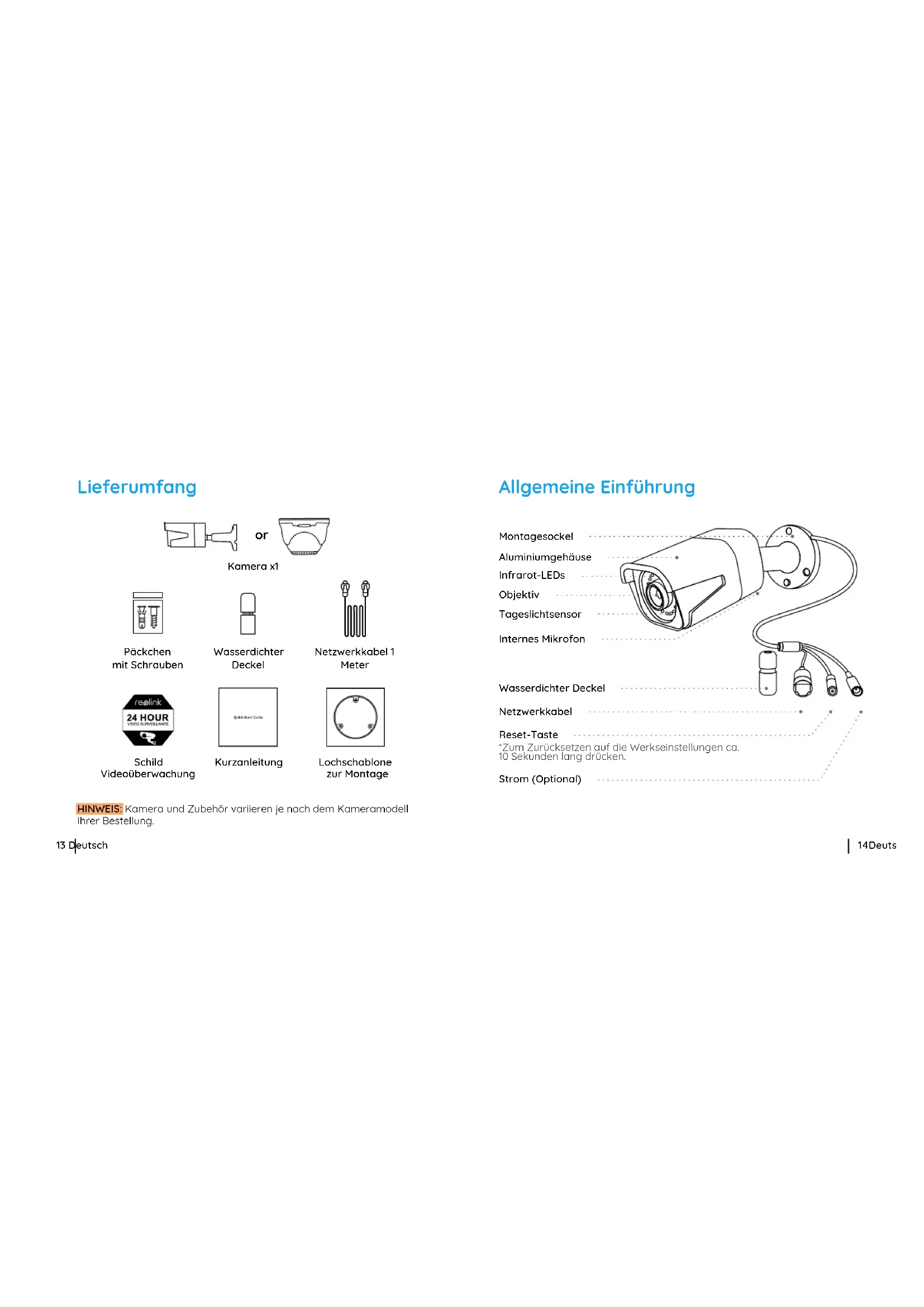 DE14Deutsch 13 Deutsch HINWEIS: Kamera und Zubehör variieren je nach dem Kameramodell Ihrer Bestellung. Lieferumfang