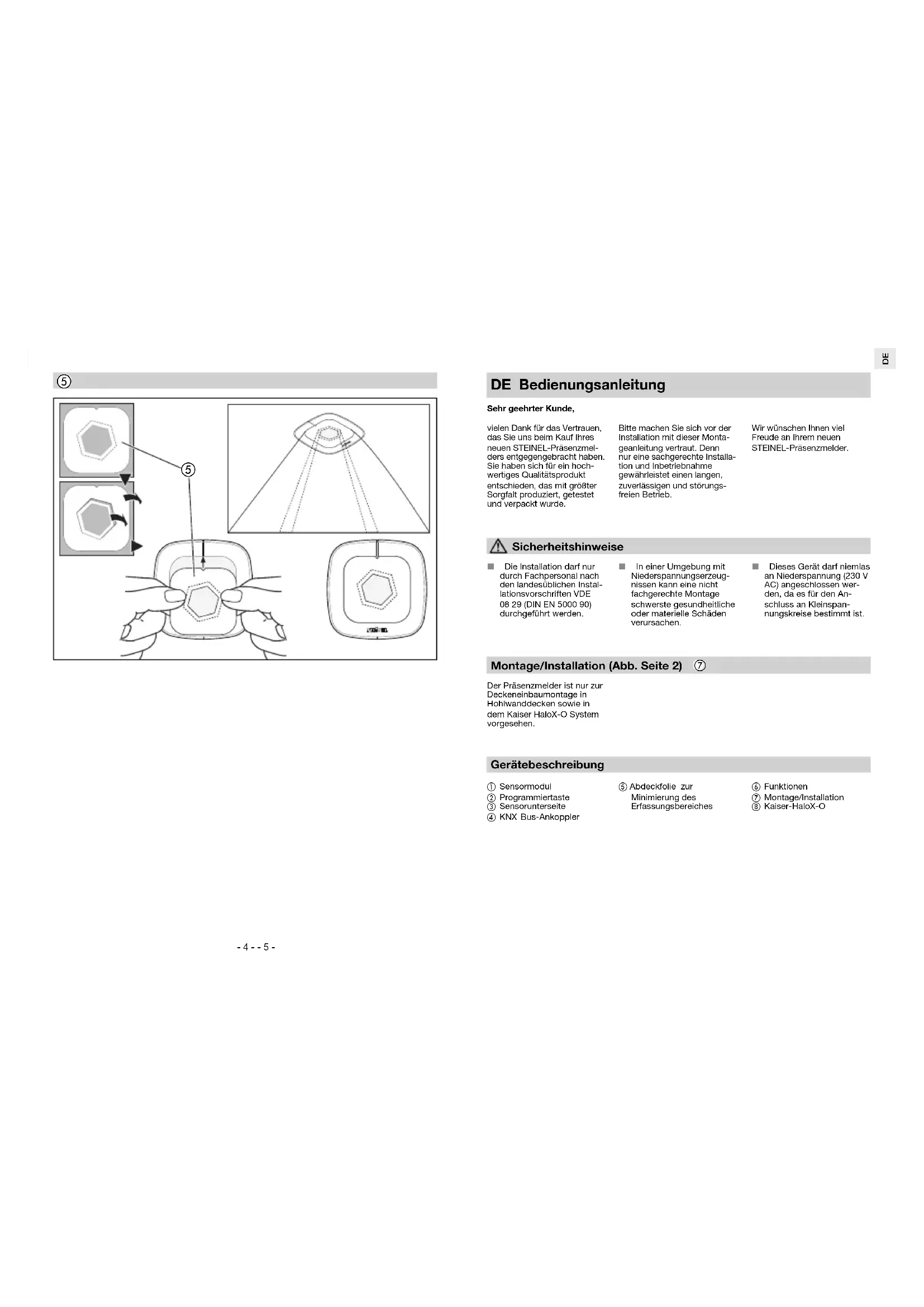 Die Installation darf nur durch Fachpersonal nach den landesüblichen Instal- lationsvorschriften VDE 08 29 (DIN EN 5000 90) durchgeführt werden. In einer Umgebung mit Niederspannungserzeug- nissen kann eine nicht fachgerechte Montage schwerste gesundheitliche oder materielle Schäden verursachen. Dieses Gerät darf niemlas an Niederspannung (230 V AC) angeschlossen wer- den, da es für den An- schluss an Kleinspan- nungskreise bestimmt ist. Gerätebeschreibung Sensormodul Programmiertaste Sensorunterseite KNX Bus-Ankoppler Abdeckfolie zur Minimierung des Erfassungsbereiches Funktionen Montage/Installation Kaiser-HaloX-O Montage/Installation (Abb. Seite 2) Der Präsenzmelder ist nur zur Deckeneinbaumontage in Hohlwanddecken sowie in dem Kaiser HaloX-O System vorgesehen. DE Bedienungsanleitung Sehr geehrter Kunde, vielen Dank für das Vertrauen, das Sie uns beim Kauf Ihres neuen STEINEL-Präsenzmel- ders entgegengebracht haben. Sie haben sich für ein hoch- wertiges Qualitätsprodukt entschieden, das mit größter Sorgfalt produziert, getestet und verpackt wurde. Bitte machen Sie sich vor der Installation mit dieser Monta- geanleitung vertraut. Denn nur eine sachgerechte Installa- tion und Inbetriebnahme gewährleistet einen langen, zuverlässigen und störungs- freien Betrieb. Wir wünschen Ihnen viel Freude an Ihrem neuen STEINEL-Präsenzmelder. Sicherheitshinweise