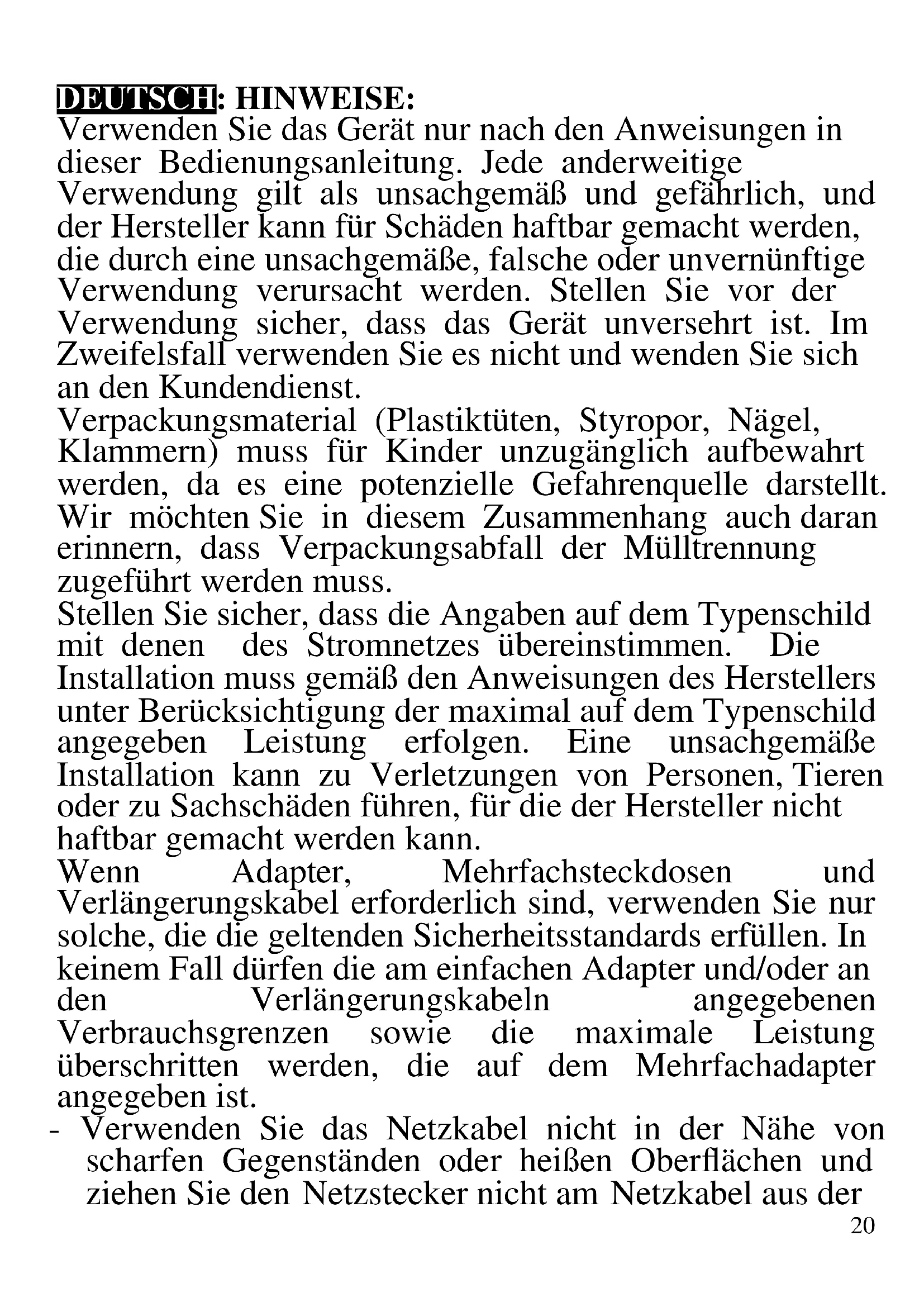 - Luz de control20 DEUTSCH: HINWEISE: Verwenden Sie das Gerät nur nach den Anweisungen in dieser Bedienungsanleitung. Jede anderweitige Verwendung gilt als unsachgemäß und gefährlich, und der Hersteller kann für Schäden haftbar gemacht werden, die durch eine unsachgemäße, falsche oder unvernünftige Verwendung verursacht werden. Stellen Sie vor der Verwendung sicher, dass das Gerät unversehrt ist. Im Zweifelsfall verwenden Sie es nicht und wenden Sie sich an den Kundendienst. Verpackungsmaterial (Plastiktüten, Styropor, Nägel, Klammern) muss für Kinder unzugänglich aufbewahrt werden, da es eine potenzielle Gefahrenquelle darstellt. Wir möchten Sie in diesem Zusammenhang auch daran erinnern, dass Verpackungsabfall der Mülltrennung zugeführt werden muss. Stellen Sie sicher, dass die Angaben auf dem Typenschild mit denen des Stromnetzes übereinstimmen. Die Installation muss gemäß den Anweisungen des Herstellers unter Berücksichtigung der maximal auf dem Typenschild angegeben Leistung erfolgen. Eine unsachgemäße Installation kann zu Verletzungen von Personen, Tieren oder zu Sachschäden führen, für die der Hersteller nicht haftbar gemacht werden kann. Wenn Adapter, Mehrfachsteckdosen und Verlängerungskabel erforderlich sind, verwenden Sie nur solche, die die geltenden Sicherheitsstandards erfüllen. In keinem Fall dürfen die am einfachen Adapter und/oder an den Verlängerungskabeln angegebenen Verbrauchsgrenzen sowie die maximale Leistung überschritten werden, die auf dem Mehrfachadapter angegeben ist. - Verwenden Sie das Netzkabel nicht in der Nähe von scharfen Gegenständen oder heißen Oberflächen und ziehen Sie den Netzstecker nicht am Netzkabel aus der21 Steckdose. Lassen Sie es nicht von der Arbeitsplatte baumeln, wo ein Kind es halten könnte. Verwenden Sie das Gerät im Falle von Schäden am Netzkabel, Stecker oder im Falle von Kurzschlüssen nicht und lassen Sie es in einer Vertragswerkstatt reparieren. - Setzen Sie das Gerät keinen ungünstigen Wetterbedingungen, wie z. B. Regen, Feuchtigkeit, Frost, aus und bewahren Sie es an einem trockenen Ort auf. Fassen Sie das Gerät nicht mit nassen Händen an und verwenden Sie es nicht barfuß. - Dieses Gerät kann nicht von Kindern verwendet werden, auch wenn diese älter als 8 Jahre sind. - Dieses Gerät kann von Personen mit eingeschränkten körperlichen, sensorischen oder geistigen Fähigkeiten oder mangelnder Erfahrung und Kenntnissen verwendet werden, wenn sie in sicherer Weise beaufsichtigt oder instruiert wurden, wie das Gerät verwendet werden kann, und die damit verbundenen Gefahren verstehen. - Kinder dürfen nicht mit dem Gerät spielen. - Bewahren Sie das Gerät und sein Netzanschluss außerhalb der Reichweite von Kinder unter 8 Jahren. - Nicht für den gewerblichen Gebrauch bestimmt. Nur für den Hausgebrauch bestimmt. Im Falle eines Defekts und/oder von Fehlfunktionen das Gerät nicht öffnen. Für Reparaturen wenden Sie sich an eine vom Hersteller autorisierte Werkstatt (Vertragswerkstatt) und fordern Sie den Einsatz von Original-Ersatzteilen. Die Nichtbeachtung der obigen Vorschriften kann die Sicherheit beeinträchtigen und zur Folge haben, dass die Garantie erlischt. WARNUNG: Dieses Gerät enthält eine Heizfunktion. Oberflächen, außer die funktionellen Oberflächen können hohe Temperaturen entwickeln. Da die Temperaturen von verschiedene Personen unterschiedlich wahrgenommen werden, sollte dieses Gerät mit VORSICHT verwendet22 werden. Halten Sie das Gerät ausschließlich auf Griffflächen die abhalten und verwenden Sie solche Hitzeschutzmaßen wie Hitzeschutzhandschuhe oder Topflappen. Dieses Gerät ist nur für den Hausgebrauch oder gleichwertiges bestimmt, in Situationen wie bspw.: Kantinen in kleinen Firmen oder ähnliche Arbeitsumgebungen, von Kunden in Hotels, Motels oder andere Art von touristische Unterkunft, wie ländlicher oder Wohn –Tourismus. Das Gerät darf nicht mit einer Zeitschaltuhr oder mit einem separaten Fernwirksystem betrieben werden Führen Sie vor jedem Gebrauch das Netzkabel aus. Setzen Sie das Produkt keinen Stößen aus, es könnte beschädigt werden. Verwenden Sie nur originale und kompatible Teile und Zubehör. ALLGEMEINE HINWEISE - Das Gerät darf nicht mit einer Zeitschaltuhr oder mit einem separaten Fernwirksystem betrieben werden - Stellen Sie das Gerät auf eine stabile und ebene Fläche. - Für Ihre Sicherheit empfiehlt es sich, das Gerät über einen Fehlerstrom - Schutzschalter (RCD) mit Ansprechstrom nicht über 30 mA versorgen zu lassen. - Das Stromkabel von den heißen Teilen des Geräts fern halten und nicht über die Arbeitsfl äche herunterhängen lassen, wo es von einem Kind erfasst werden könnte. - Während des Betriebs wird das Gerät sehr heiß. Deshalb muss vorsichtig damit umgegangen und darauf geachtet werden, dass die heißen Teile wie Kochfeld und Gehäuse nicht berührt werden. - Das Gerät nicht in der Nähe oder unterhalb von brennbaren Mater ial ien (z.B. Gardinen) aufstellen. - Das Gerät während des Betriebs nicht unbeaufsichtigt stehen lassen.23 - Stellen Sie das Gerät, während des Betriebes, nicht gegen Wände oder unter Regale, Tische, usw. Keine in Aluminium- und/oder Plastikfolie gewickelten Nahrungsmittel auf das Kochfeld legen. - Die Nahrungsmittel nicht direkt auf das Kochfeld legen, sondern geeignete Behälter verwenden. - Warten Sie ab, bis sich das Gerät völlig abgekühlt hat, bevor Sie es wegräumen. - Das Gerät darf nicht im Regen, im Freien oder in feuchter Umgebung verwendet werden. - Das Gerät, das Kabel und den Versorgungsstecker KEINESFALLS in Wasser tauchen. - KEINESFALLS Metallgegenstände auf das Kochfeld legen, noch diese mit den Fingern berühren. - Das Gerät nicht in Räumen bet reiben, die Sprengstoff, brennbare Gase oder entzündliche Flüssigkeiten enthalten (Lacke, Leim, Spraydosen, usw). - Ziehen Sie den Netzstecker, nach Ge-brauch immer aus der Steckdose BESCHREIBUNG G10121 1 Regelthermost