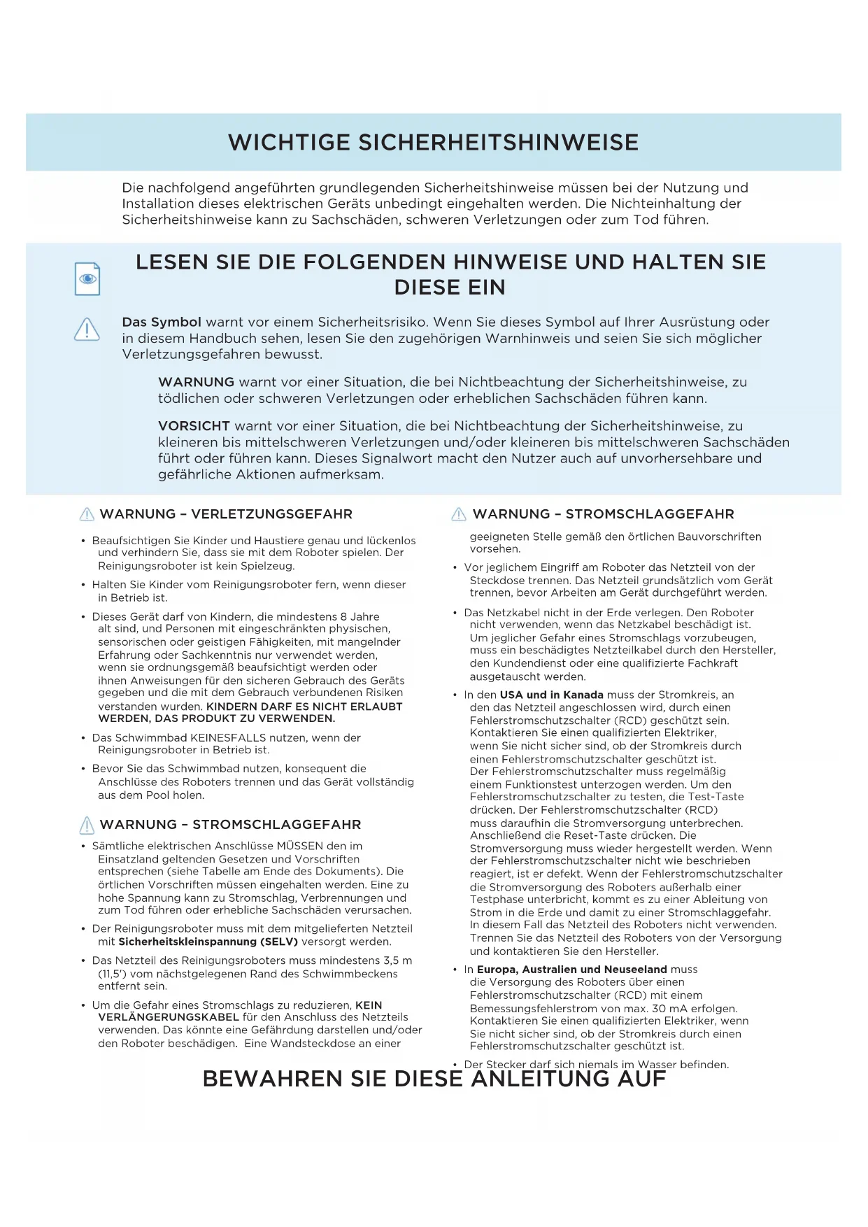 - DEN POOL KEINESFALLS NUTZEN, WENN DER REINIGUNGSROBOTER IN BETRIEB IST.