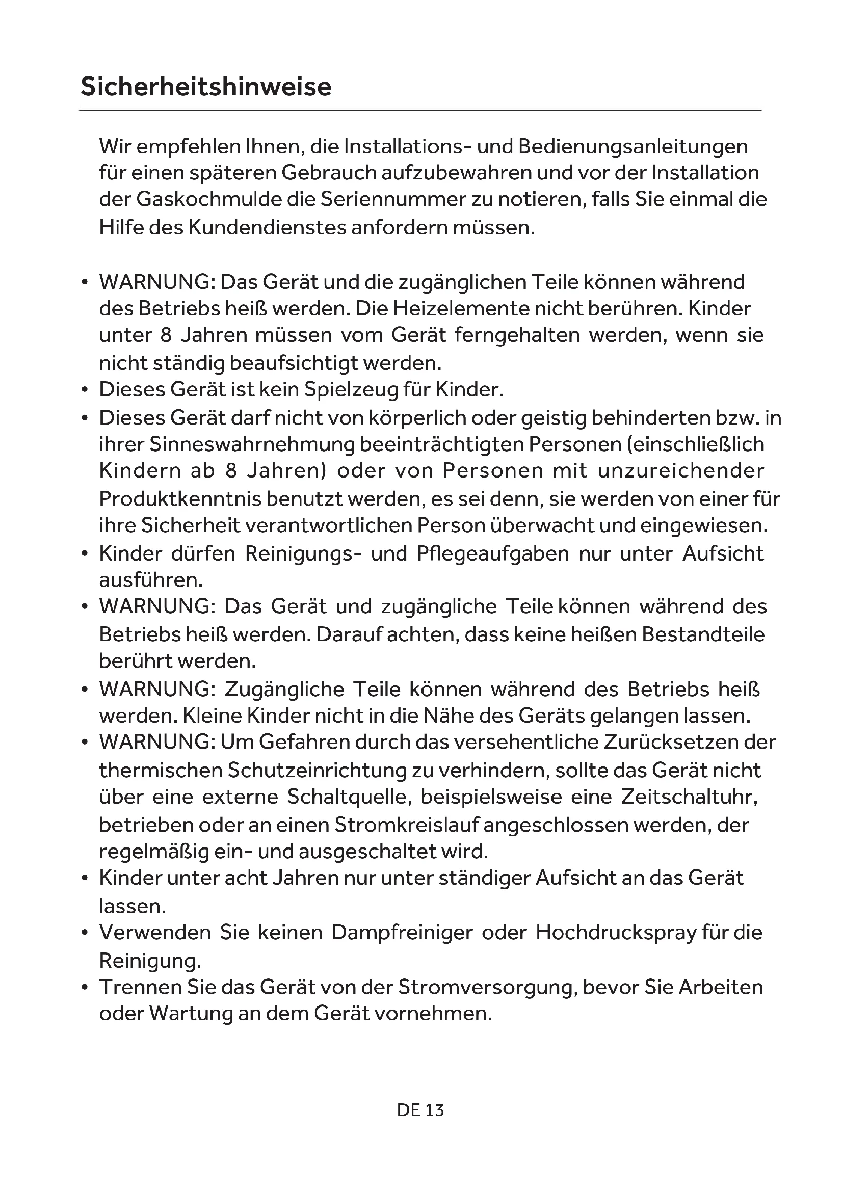 ENVIRONMENT Where possible use lid to cover the pan. Regulate the flame to not overlap the EN 12 “Vald only for Cyprus”DE 13 Dieses Gerät darf nicht von körperlich oder geistig behinderten bzw. in ihrer Sinneswahrnehmung beeinträchtigten Personen (einschließlich Kindern ab 8 Jahren) oder von Personen mit unzureichender Produktkenntnis benutzt werden, es sei denn, sie werden von einer für ihre Sicherheit verantwortlichen Person überwacht und eingewiesen. Dieses Gerät ist kein Spielzeug für Kinder. Verwenden Sie keinen Dampfreiniger oder Hochdruckspray für die Reinigung. WARNUNG: Das Gerät und die zugänglichen Teile können während des Betriebs heiß werden. Die Heizelemente nicht berühren. Kinder unter 8 Jahren müssen vom Gerät ferngehalten werden, wenn sie nicht ständig beaufsichtigt werden. Wir empfehlen Ihnen, die Installations- und Bedienungsanleitungen für einen späteren Gebrauch aufzubewahren und vor der Installation der Gaskochmulde die Seriennummer zu notieren, falls Sie einmal die Hilfe des Kundendienstes anfordern müssen. Kinder dürfen Reinigungs- und Pflegeaufgaben nur unter Aufsicht ausführen. WARNUNG: Das Gerät und zugängliche Teile können während des Betriebs heiß werden. Darauf achten, dass keine heißen Bestandteile berührt werden. WARNUNG: Zugängliche Teile können während des Betriebs heiß werden. Kleine Kinder nicht in die Nähe des Geräts gelangen lassen. WARNUNG: Um Gefahren durch das versehentliche Zurücksetzen der thermischen Schutzeinrichtung zu verhindern, sollte das Gerät nicht über eine externe Schaltquelle, beispielsweise eine Zeitschaltuhr, betrieben oder an einen Stromkreislauf angeschlossen werden, der regelmäßig ein- und ausgeschaltet wird. Kinder unter acht Jahren nur unter ständiger Aufsicht an das Gerät lassen. Trennen Sie das Gerät von der Stromversorgung, bevor Sie Arbeiten oder Wartung an dem Gerät vornehmen. Sicherheitshinweise