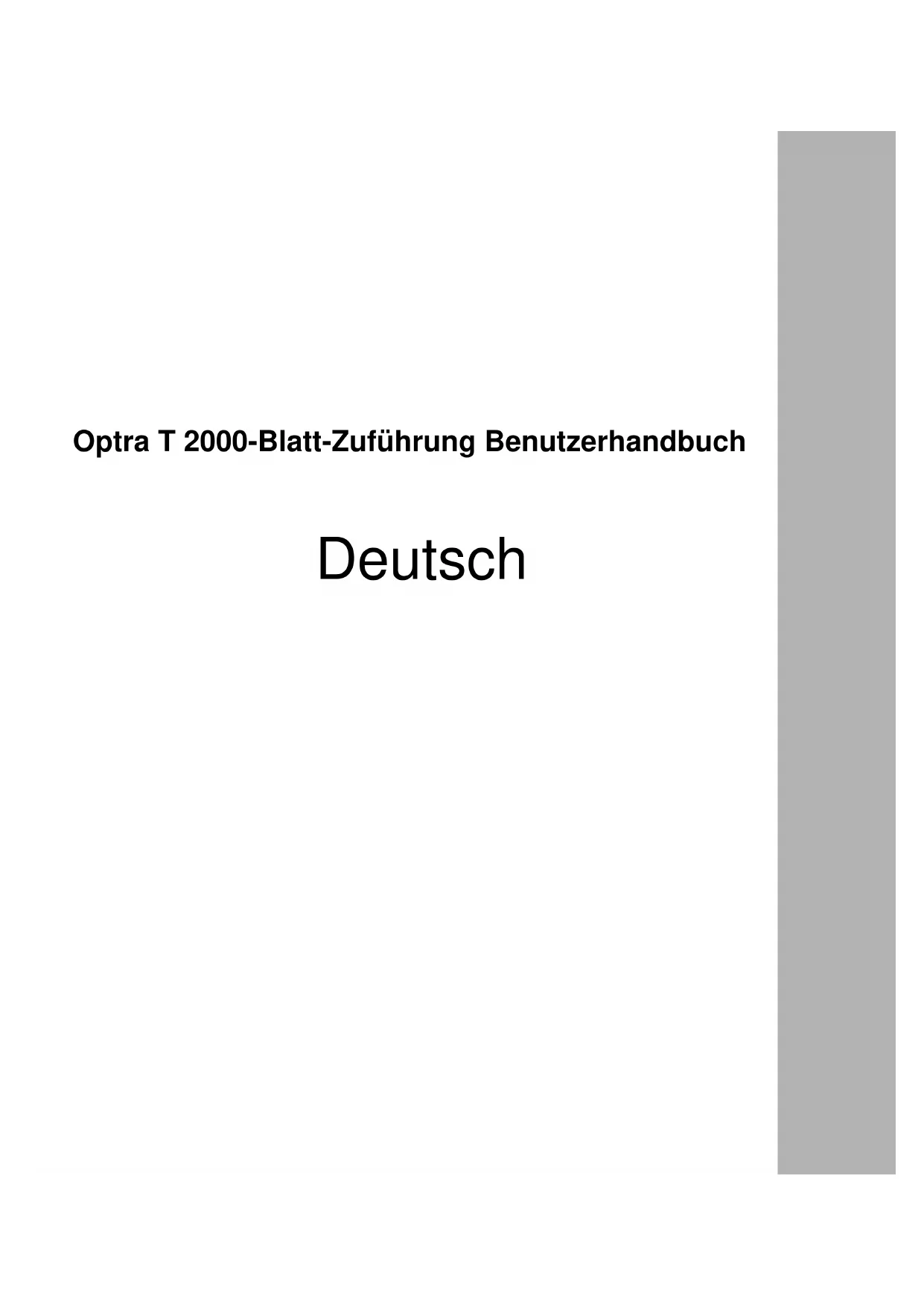 - Sélectionnez Reprise pour poursuivre l’impression. Pour de plus amples informations sur le dégagement des bourrages de papier, reportez-vous à la documentation de l’imprimante. Bouton de descente du tiroir élévateurManuel d’utilisation du tiroir 2000 feuilles 22Deutsch Optra T 2000-Blatt-Zuführung BenutzerhandbuchErste Ausgabe (Juni 1999) Der folgende Abschnitt gilt nicht für Länder, in denen die nachstehenden Bestimmungen nicht mit dem geltenden Recht vereinbar sind. LEXMARK INTERNATIONAL ÜBERNIMMT FÜR DIE VORLIEGENDE DOKUMENTATION KEINERLEI GEWÄHRLEISTUNG IRGENDWELCHER ART, WEDER AUSDRÜCKLICH NOCH STILLSCHWEIGEND, EINSCHLIESSLICH, JEDOCH NICHT AUSSCHLIESSLICH DER STILLSCHWEIGENDEN GEWÄHRLEISTUNG FÜR DIE HANDELSÜBLICHKEIT ODER DIE EIGNUNG FÜR EINEN BESTIMMTEN ZWECK. In einigen Ländern sind ausdrückliche oder stillschweigende Gewährleistungsausschlüsse für bestimmte Transaktionen nicht zulässig. Diese Erklärung betrifft Sie deshalb möglicherweise nicht. Diese Dokumentation enthält möglicherweise technische Ungenauigkeiten oder typographische Fehler. An den enthaltenen Informationen werden in regelmäßigen Abständen Änderungen vorgenommen. Diese Änderungen werden in späteren Ausgaben berücksichtigt. Verbesserungen oder Änderungen der beschriebenen Produkte oder Programme bleiben vorbehalten. Durch Bezugnahme auf bestimmte Produkte, Programme oder Dienstleistungen in der vorliegenden Dokumentation übernimmt der Hersteller keine Gewährleistung für die Verfügbarkeit dieser Produkte, Programme oder Dienstleistungen in allen Ländern seines Tätigkeitsbereichs. Die Nennung eines Produkts, eines Programms oder einer Dienstleistung besagt weder ausdrücklich noch stillschweigend, daß ausschließlich dieses Produkt, dieses Programm oder diese Dienstleistung verwendet werden kann. Andere Produkte, Programme bzw. Dienstleistungen mit vergleichbarer Funktionalität können ebenfalls verwendet werden, sofern kein Verstoß gegen das Urheberrecht vorliegt. Die Bewertung und Überprüfung des Betriebs mit anderen als den vom Hersteller ausdrücklich genannten Produkten, Programmen oder Dienstleistungen durch den Benutzer erfolgt auf eigene Verantwortung. Lexmark und Optra sind Warenzeichen von Lexmark International, Inc., eingetragen in den Vereinigten Staaten und/oder anderen Ländern. Sonstige Warenzeichen sind Eigentum ihrer jeweiligen Inhaber. © Copyright 1999 Lexmark International, Inc. Alle Rechte vorbehalten. EINGESCHRÄNKTE RECHTE DER REGIERUNG DER VEREINIGTEN STAATEN VON AMERIKA. Die vorliegende Software und Dokumentation werden mit EINGESCHRÄNKTEN RECHTEN zur Verfügung gestellt. Die Verwendung, Vervielfältigung oder Offenlegung seitens der Regierung unterliegt den Einschränkungen, die in Absatz (c)(1)(ii) der Klausel „Rights in Technical Data and Computer Software“ unter DFARS 252.227-7013 und in anwendbaren FAR-Bestimmungen festgelegt sind: Lexmark International, Inc., Lexington, KY 40550.2000-Blatt-Zuführung - Benutzerhandbuch Inhalt Einführung p. 1