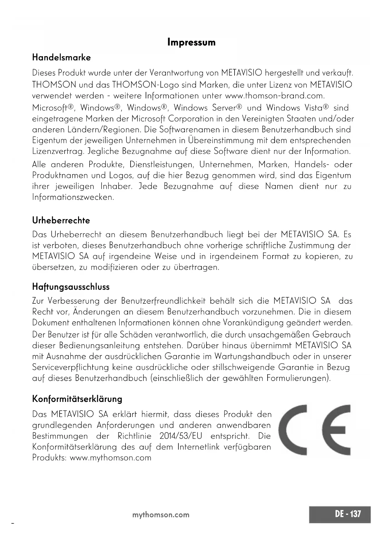 mythomson.com Impressum Handelsmarke Dieses Produkt wurde unter der Verantwortung von METAVISIO hergestellt und verkauft. THOMSON und das THOMSON-Logo sind Marken, die unter Lizenz von METAVISIO verwendet werden - weitere Informationen unter www.thomson-brand.com. Microsoft®, Windows®, Windows®, Windows Server® und Windows Vista® sind eingetragene Marken der Microsoft Corporation in den Vereinigten Staaten und/oder anderen Ländern/Regionen. Die Softwarenamen in diesem Benutzerhandbuch sind Eigentum der jeweiligen Unternehmen in Übereinstimmung mit dem entsprechenden Lizenzvertrag. Jegliche Bezugnahme auf diese Software dient nur der Information. Alle anderen Produkte, Dienstleistungen, Unternehmen, Marken, Handels- oder Produktnamen und Logos, auf die hier Bezug genommen wird, sind das Eigentum ihrer jeweiligen Inhaber. Jede Bezugnahme auf diese Namen dient nur zu Informationszwecken. Urheberrechte Das Urheberrecht an diesem Benutzerhandbuch liegt bei der METAVISIO SA. Es ist verboten, dieses Benutzerhandbuch ohne vorherige schriftliche Zustimmung der METAVISIO SA auf irgendeine Weise und in irgendeinem Format zu kopieren, zu übersetzen, zu modizieren oder zu übertragen. Haftungsausschluss Zur Verbesserung der Benutzerfreundlichkeit behält sich die METAVISIO SA das Recht vor, Änderungen an diesem Benutzerhandbuch vorzunehmen. Die in diesem Dokument enthaltenen Informationen können ohne Vorankündigung geändert werden. Der Benutzer ist für alle Schäden verantwortlich, die durch unsachgemäßen Gebrauch dieser Bedienungsanleitung entstehen. Darüber hinaus übernimmt METAVISIO SA mit Ausnahme der ausdrücklichen Garantie im Wartungshandbuch oder in unserer Serviceverpichtung keine ausdrückliche oder stillschweigende Garantie in Bezug auf dieses Benutzerhandbuch (einschließlich der gewählten Formulierungen). Konformitätserklärung Das METAVISIO SA erklärt hiermit, dass dieses Produkt den grundlegenden Anforderungen und anderen anwendbaren Bestimmungen der Richtlinie 2014/53/EU entspricht. Die Konformitätserklärung des auf dem Internetlink verfügbaren Produkts: www.mythomson.com138 - DE Benutzerhandbuch - Neo - 15.6’’ mythomson.com - Wichtige Sicherheitshinweise - Dieses Gerät sollte in einer Umgebung mit einer Umgebungstemperatur zwischen 5°C (41°F) und 35°C (95°F) eingesetzt werden. Setzen Sie das Gerät weder Regen noch Feuchtigkeit aus und halten Sie es von Flüssigkeiten fern. Wenn Wasser oder andere Flüssigkeiten auf das Gerät spritzen, schalten Sie das Gerät sofort aus und warten Sie, bis es vollständig trocken ist, bevor Sie es wieder einschalten. Setzen Sie das Gerät nicht direkt der Sonneneinstrahlung aus. Verwenden Sie keine starken Lösungsmittel, üssigen Reinigungsmittel oder andere Chemikalien auf oder in der Nähe der Oberäche des Geräts, um Korrosion oder Beschädigung der Oberäche des Geräts zu vermeiden. Setzen Sie die Kamera nicht einer staubigen Umgebung aus. Verwenden Sie das Gerät nicht während eines Gaslecks. Setzen Sie das Gerät keinen starken magnetischen oder elektrischen Feldern aus. Sie können das Gerät über Flughafen-Röntgendetektoren betreiben. Es wird jedoch empfohlen, Ihr Gerät nicht durch die Magnetdetektionsportale zu führen oder es tragbaren Detektoren auszusetzen. Stellen Sie keine Gegenstände auf das Gerät. Stellen Sie das Gerät nicht auf eine unebene oder instabile Fläche. Achten Sie darauf, das Gerät vor Stürzen oder anderen Stößen zu schützen, die es beschädigen könnten. Lassen Sie das Gerät nicht auf Ihrem Schoß oder einem anderen Körperteil liegen oder auf ihn geladen, um die Gefahr von hitzebedingten Verletzungen zu vermeiden. Schalten Sie das Gerät vor dem Transport aus oder bedecken Sie es mit einem Material, das keine optimale Luftzirkulation zulässt. Verwenden Sie keine beschädigten Netzkabel, Zubehör oder andere Geräte mit Ihrem Gerät. Wir empfehlen die ausschließliche Verwendung des mitgelieferten Zubehörs (Netzteil, Kabel usw.).DE - 139 mythomson.com Verwenden Sie nur Originalbatterien. Das Ersetzen der Batterie durch eine falsche Batterie kann zu einer Explosion führen. Demontieren, modizieren oder reparieren Sie das Gerät nicht selbst, da dies zum Erlöschen der Garantie führen kann. Bitte sichern Sie Ihre wichtigen Inhalte regelmäßig, um Datenverlust zu vermeiden. Unser Unternehmen übernimmt keine Verantwortung für den Verlust oder die Entfernung von Gegenständen, die im Gerät enthalten sind, aufgrund von unsachgemäßem Gebrauch der Hard- oder Software, mangelnder Wartung oder eines anderen zufälligen Ereignisses. Demontieren, modizieren oder reparieren Sie das Gerät nicht selbst, da dies zum Erlöschen der Garantie führen kann. Bitte sichern Sie Ihre wichtigen Inhalte regelmäßig, um Datenverlust zu vermeiden. Unser Unternehmen übernimmt keine Verantwortung für den Verlust oder die Entfernung von Gegenständen, die im Gerät enthalten sind, aufgrund von unsachgemäßem Gebrauch der Hard- oder Software, mangelnder Wartung oder eines anderen zufälligen Ereignisses. Dieses Produkt wurde entwickelt, um ein ordnungsgemäßes Recycling von Teilen und Komponenten zu ermöglichen. Das Symbol für einen durchgestrichenen Müllbehälter auf Rädern zeigt an, dass das Gerät nicht über den Hausmüll entsorgt werden darf. Beachten Sie die örtlichen Vorschriften für die Entsorgung von elektronischen Geräten. Das Symbol für einen durchgestrichenen Müllcontainer zeigt an, dass die Batterie nicht über den Hausmüll entsorgt werden darf. Beachten Sie die örtlichen Vorschriften für die Entsorgung von Batterien. Um mögliche Gehörschäden zu vermeiden, sollten Sie nicht über einen längeren Zeitraum mit hoher Lautstärke zuhören.140 - DE Benutzerhandbuch - Neo - 15.6’’ mythomson.comDE - 141 mythomson.com142 - DE Benutzerhandbuch - Neo - 15.6’’ mythomson.com - Einschalten - Hinweis : Laden Sie Ihr Thomson-Gerät auf, bevor Sie es zum ersten Mal verwe