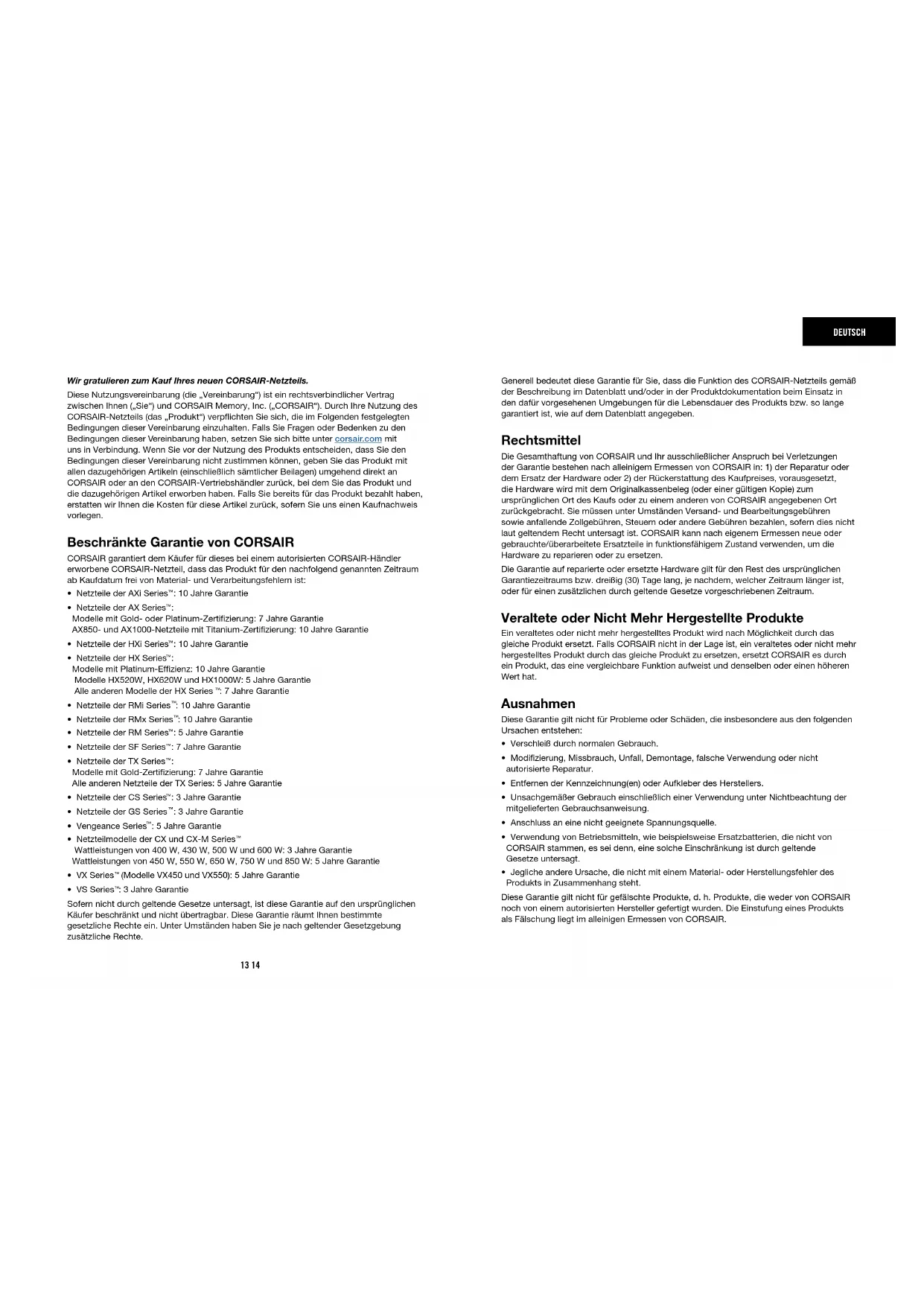 sécurité entraînera l’annulation immédiate de toute garantie.13 14 DEUTSCH Wir gratulieren zum Kauf Ihres neuen CORSAIR-Netzteils. Diese Nutzungsvereinbarung (die „Vereinbarung“) ist ein rechtsverbindlicher Vertrag zwischen Ihnen („Sie“) und CORSAIR Memory, Inc. („CORSAIR“). Durch Ihre Nutzung des CORSAIR-Netzteils (das „Produkt“) verpflichten Sie sich, die im Folgenden festgelegten Bedingungen dieser Vereinbarung einzuhalten. Falls Sie Fragen oder Bedenken zu den Bedingungen dieser Vereinbarung haben, setzen Sie sich bitte unter corsair.com mit uns in Verbindung. Wenn Sie vor der Nutzung des Produkts entscheiden, dass Sie den Bedingungen dieser Vereinbarung nicht zustimmen können, geben Sie das Produkt mit allen dazugehörigen Artikeln (einschließlich sämtlicher Beilagen) umgehend direkt an CORSAIR oder an den CORSAIR-Vertriebshändler zurück, bei dem Sie das Produkt und die dazugehörigen Artikel erworben haben. Falls Sie bereits für das Produkt bezahlt haben, erstatten wir Ihnen die Kosten für diese Artikel zurück, sofern Sie uns einen Kaufnachweis vorlegen. Beschränkte Garantie von CORSAIR CORSAIR garantiert dem Käufer für dieses bei einem autorisierten CORSAIR-Händler erworbene CORSAIR-Netzteil, dass das Produkt für den nachfolgend genannten Zeitraum ab Kaufdatum frei von Material- und Verarbeitungsfehlern ist: