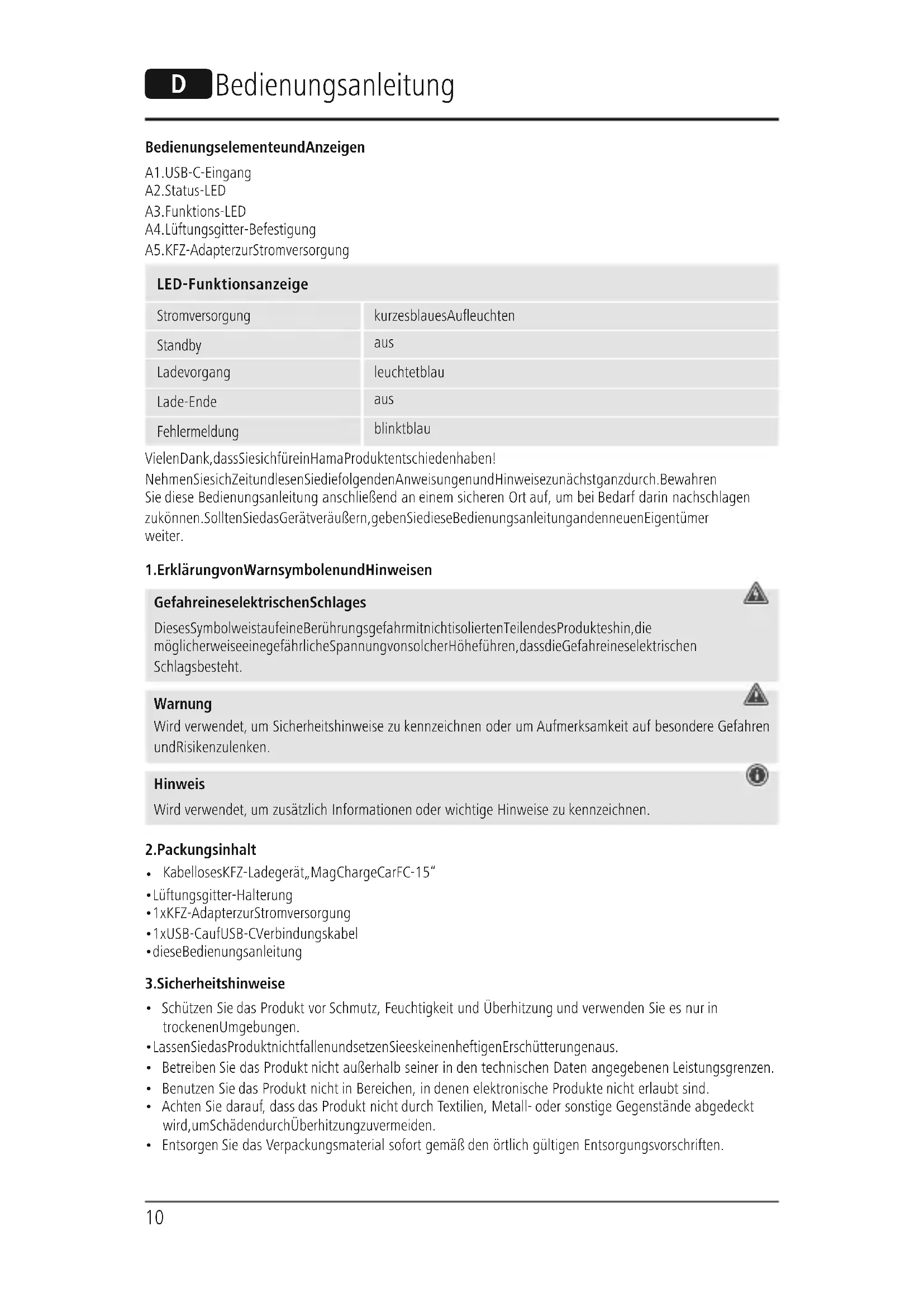 Hama GmbH &CoKG hereby declares that the radio equipment type [00187268] is in compliance with Directive 2014/53/EU.The full text of the EU declaration of conformity is available at the following internet address: www.hama.com ->00187268->Downloads. Frequency band(s) 112.600KHz –152.600 KHz Maximum radio-frequency power transmitted -14.69dBµA/m at 10m10 D Bedienungsanleitung Bedienungselemente und Anzeigen A1. USB-C-Eingang A2. Status-LED A3. Funktions-LED A4. Lüftungsgitter-Befestigung A5. KFZ-Adapter zur Stromversorgung LED-Funktionsanzeige Stromversorgung kurzes blaues Aueuchten Standby aus Ladevorgang leuchtet blau Lade-Ende aus Fehlermeldung blinkt blau Vielen Dank, dass Sie sich für ein Hama Produkt entschieden haben! Nehmen Sie sich Zeit und lesen Sie die folgenden Anweisungen und Hinweise zunächst ganz durch. Bewahren Sie diese Bedienungsanleitung anschließend an einem sicheren Ort auf,umbei Bedarf darin nachschlagen zu können. Sollten Sie das Gerät veräußern, geben Sie diese Bedienungsanleitung an den neuen Eigentümer weiter.
