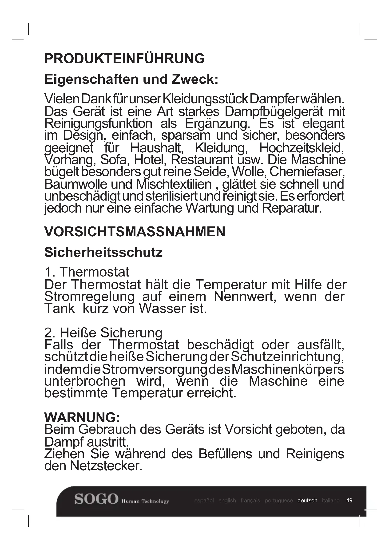 Wartung des SOGO-Dampfgarers Reinigen und spülen Sie Ihren SOGO-Dampfgarer regelmäßig. Alle Dampfer müssen gelegentlich gereinigt und gespült werden, um mineralische Ablagerungen zu entfernen. Wenn der Dampf des SOGO-Dampfgarers unterbrochen wird oder stoppt, lesen Sie bitte den Abschnitt zur Reinigung von Mineralablagerungen. Niemals Zusatzstoe verwenden. Zusätze wie Salz, Parfums und Farbstoe sollten niemals in den Wassertank gegeben werden. Diese Substanzen korrodieren oder verstopfen die inneren Teile. Dämpfen Sie in senkrechter, aufrechter Position. Verwenden Sie Ihren SOGO-Dampfgarer nicht in horizontaler Position wie ein Bügeleisen. Dämpfen Sie in einer vertikalen Auf- und Abbewegung. Dadurch kann das Kondenswasser im Schlauch in die Haupteinheit zurückießen. Ziehen Sie den SOGO-Dampfgarer nicht am Netzkabel. Wenn Sie den SOGO-Dampfgarer am Netzkabel ziehen, kann sich die interne Verkabelung lösen. Verwenden Sie niemals Ihren Fuß, um den SOGO-Dampfgarer ein- oder auszuschalten. Der Netzschalter kann beschädigt werden, wenn Sie das Gerät mit dem Fuß unter übermäßigem Druck ausschalten.60 español english français portuguese deutsch italiano Aufbewahrung des SOGO Garment Steamer. Leeren Sie das gesamte Wasser aus dem Hauptgerät, bevor Sie den SOGO-Dampfgarer für einen längeren Zeitraum (mindestens 30 Tage) aufbewahren. Wasser wird mit der Zeit abgestanden und kann die inneren Teile verstopfen. SOGO Kleiddampfer Tipps und FAQs