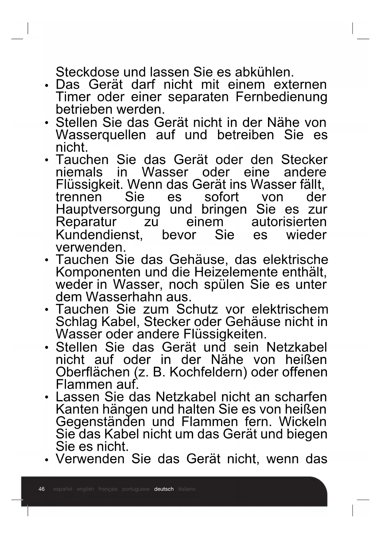 Ziehen Sie vor dem Reinigen oder Lagern Ihres Geräts immer den Netzstecker aus der46 español english français portuguese deutsch italiano Steckdose und lassen Sie es abkühlen.