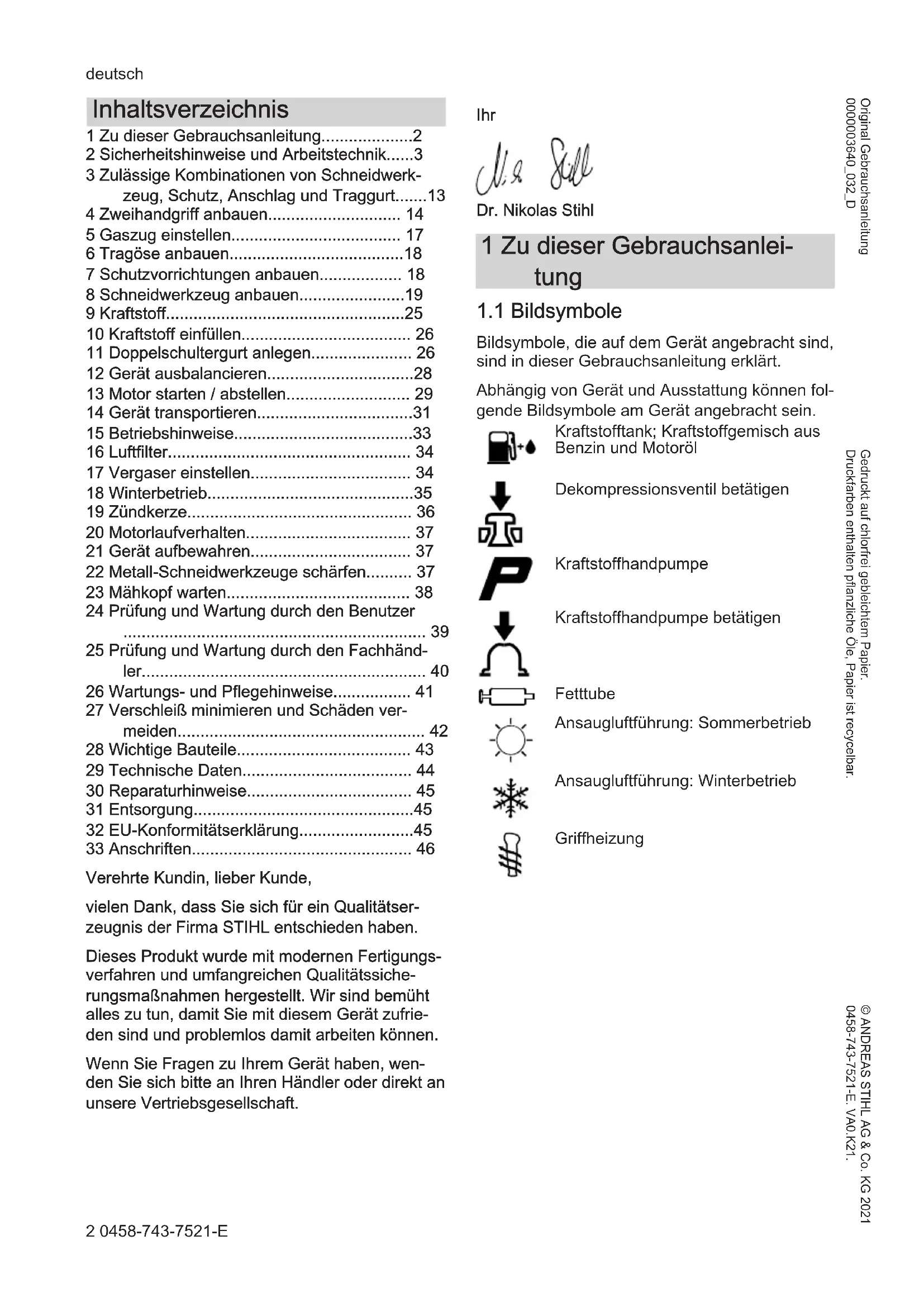 - 33 Anschriften Verehrte Kundin, lieber Kunde, vielen Dank, dass Sie sich für ein Qualitätser‐ zeugnis der Firma STIHL entschieden haben. Dieses Produkt wurde mit modernen Fertigungs‐ verfahren und umfangreichen Qualitätssiche‐ rungsmaßnahmen hergestellt. Wir sind bemüht alles zu tun, damit Sie mit diesem Gerät zufrie‐ den sind und problemlos damit arbeiten können. Wenn Sie Fragen zu Ihrem Gerät haben, wen‐ den Sie sich bitte an Ihren Händler oder direkt an unsere Vertriebsgesellschaft. Ihr Dr. Nikolas Stihl 1 Zu dieser Gebrauchsanlei‐ tung p. 46