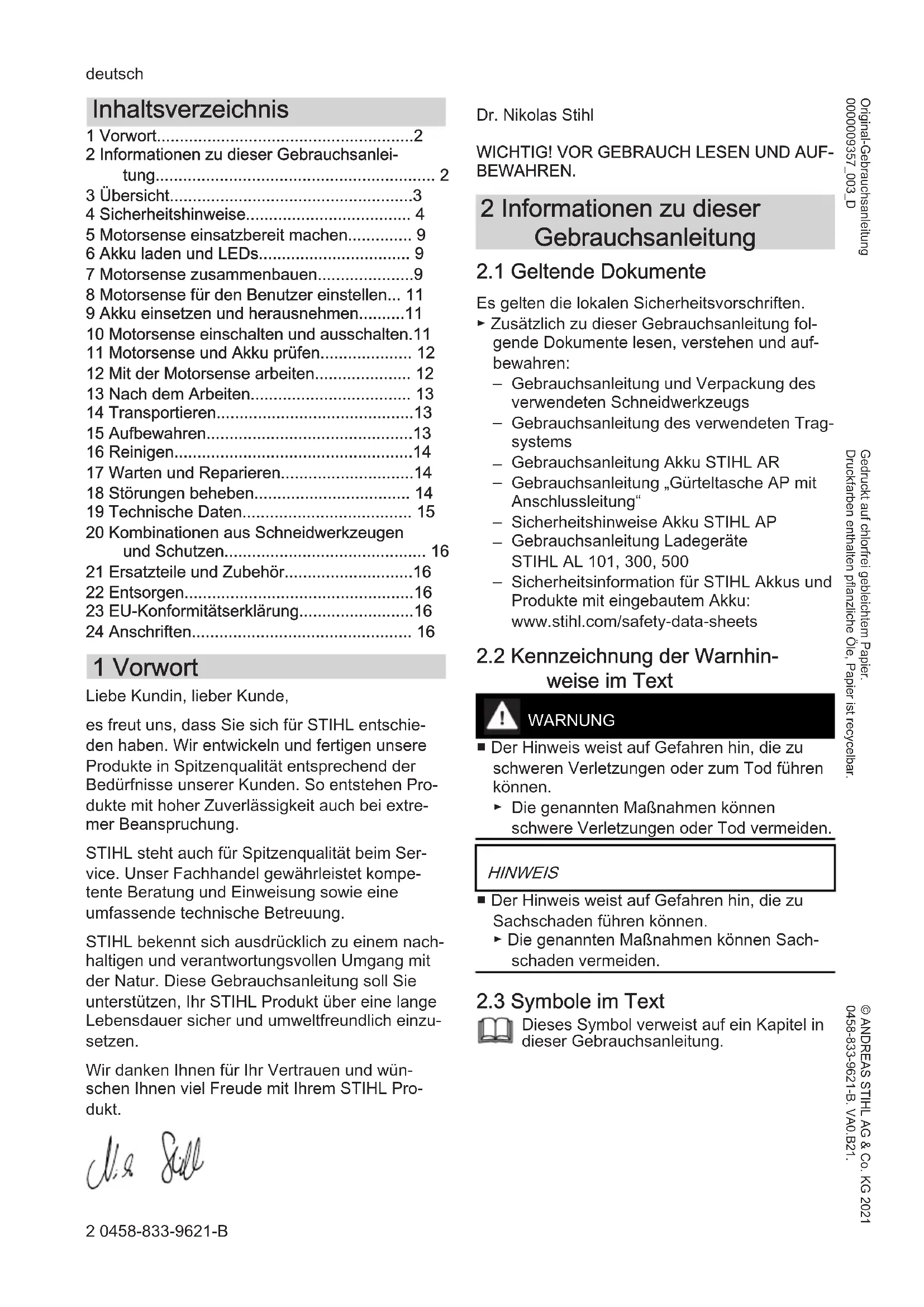 - 24 Anschriften 1 Vorwort Liebe Kundin, lieber Kunde, es freut uns, dass Sie sich für STIHL entschie‐ den haben. Wir entwickeln und fertigen unsere Produkte in Spitzenqualität entsprechend der Bedürfnisse unserer Kunden. So entstehen Pro‐ dukte mit hoher Zuverlässigkeit auch bei extre‐ mer Beanspruchung. STIHL steht auch für Spitzenqualität beim Ser‐ vice. Unser Fachhandel gewährleistet kompe‐ tente Beratung und Einweisung sowie eine umfassende technische Betreuung. STIHL bekennt sich ausdrücklich zu einem nach‐ haltigen und verantwortungsvollen Umgang mit der Natur. Diese Gebrauchsanleitung soll Sie unterstützen, Ihr STIHL Produkt über eine lange Lebensdauer sicher und umweltfreundlich einzu‐ setzen. Wir danken Ihnen für Ihr Vertrauen und wün‐ schen Ihnen viel Freude mit Ihrem STIHL Pro‐ dukt. Dr. Nikolas Stihl p. 16