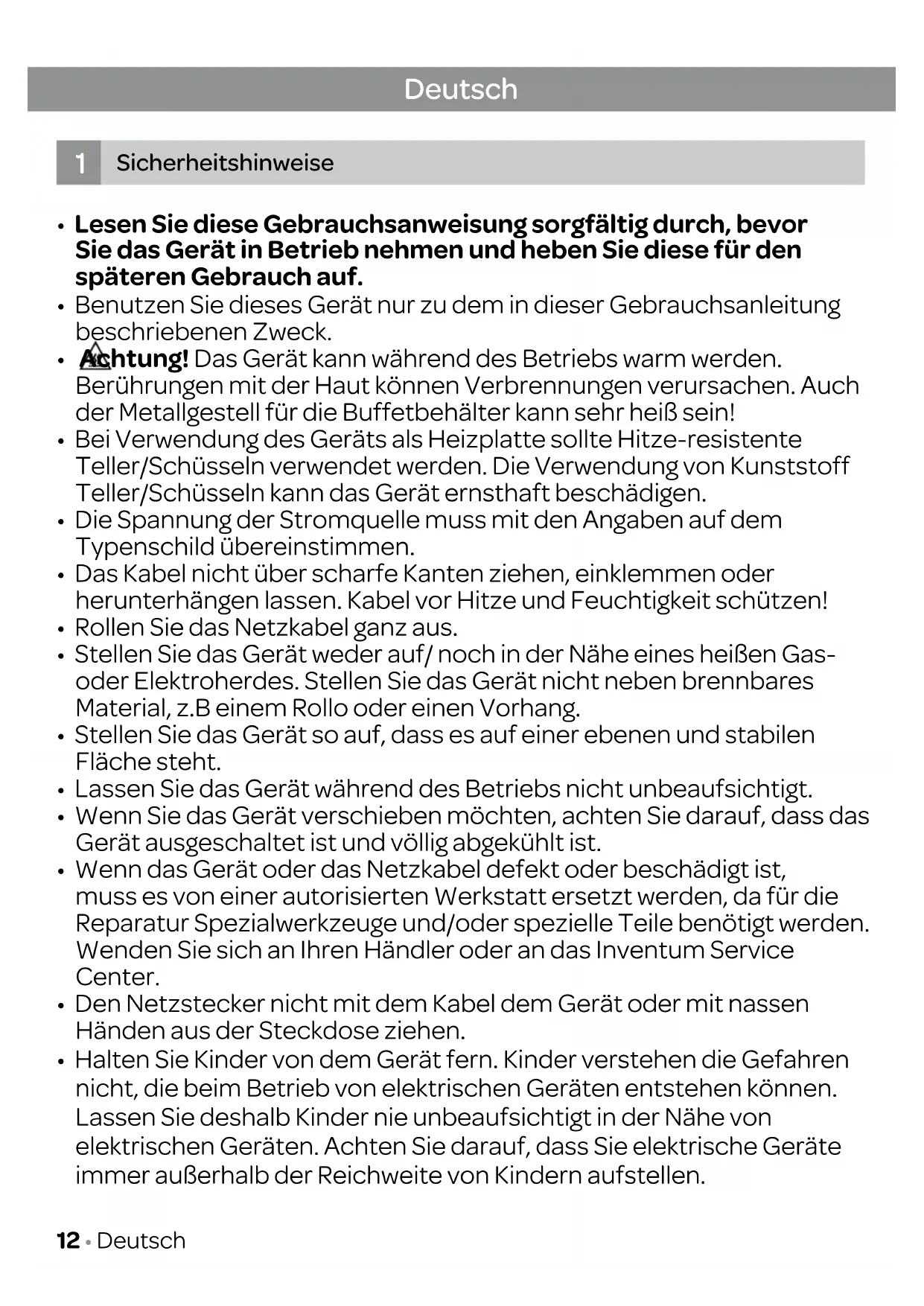 - Achtung! Das Gerät kann während des Betriebs warm werden. Berührungen mit der Haut können Verbrennungen verursachen. Auch der Metallgestell für die Buffetbehälter kann sehr heiß sein!