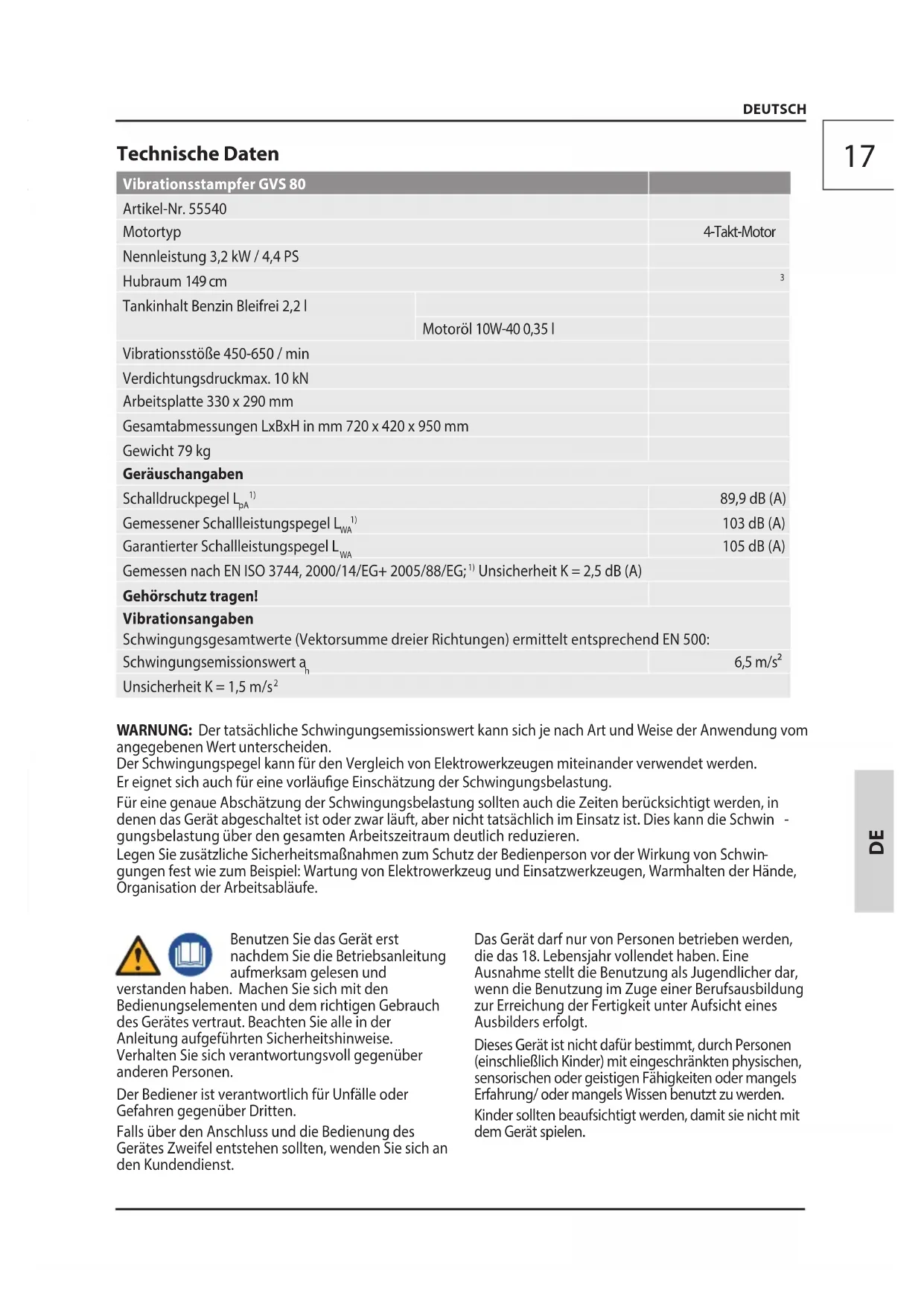 Tankinhalt Benzin Bleifrei 2,2 l Motoröl 10W-40 0,35 l Vibrationsstöße 450-650 / min Verdichtungsdruckmax. 10 kN Arbeitsplatte 330 x 290 mm Gesamtabmessungen LxBxH in mm 720 x 420 x 950 mm Gewicht 79 kg Geräuschangaben Schalldruckpegel L