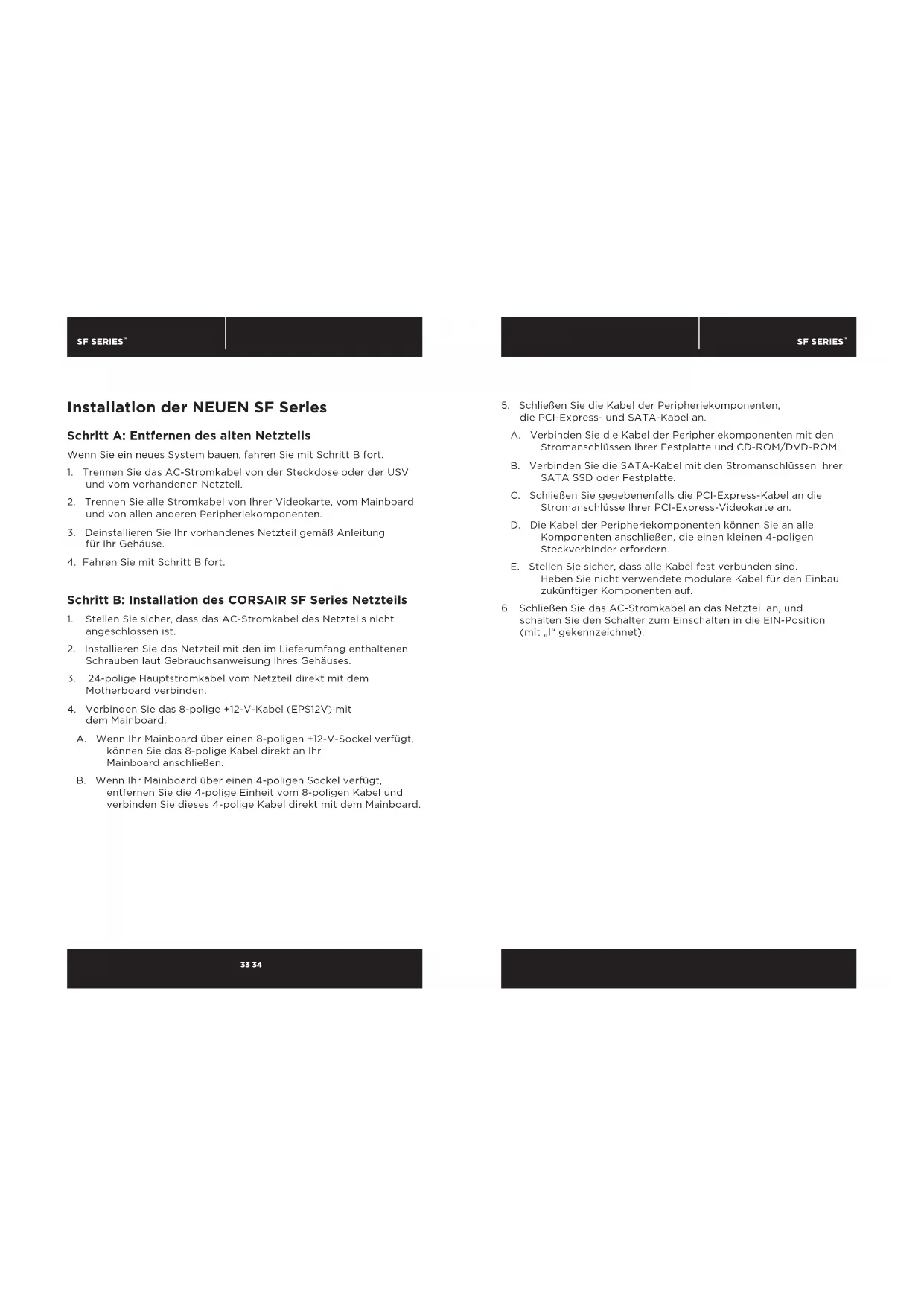 PRODUKTSPEZIFIKATIONEN SF .................................................. SF .................................................. SF .................................................. Installation ......................................... WichtigeSicherheitshinweise ......... Wir gratulieren zum Kauf Ihres neuen SFX-Hochleistungsnetzteils von CORSAIR. Die Netzteile der SF Series bestechen durch einen als 80PLUS Platinum zertifizierten Wirkungsgrad, hervorragende elektrische Leistung und einen praktisch geräuschlosen Betrieb in einem SFX-Formfaktor. Mit japanischen 105-Grad-Kondensatoren und einem Zero RPM-Lüftermodus sind sie eine hervorragende Wahl für sehr leistungsstarke PCs mit kleinem Formfaktor, für die Zuverlässigkeit und Geräuscharmut unerlässlich sind. Sicherheit und Schutz