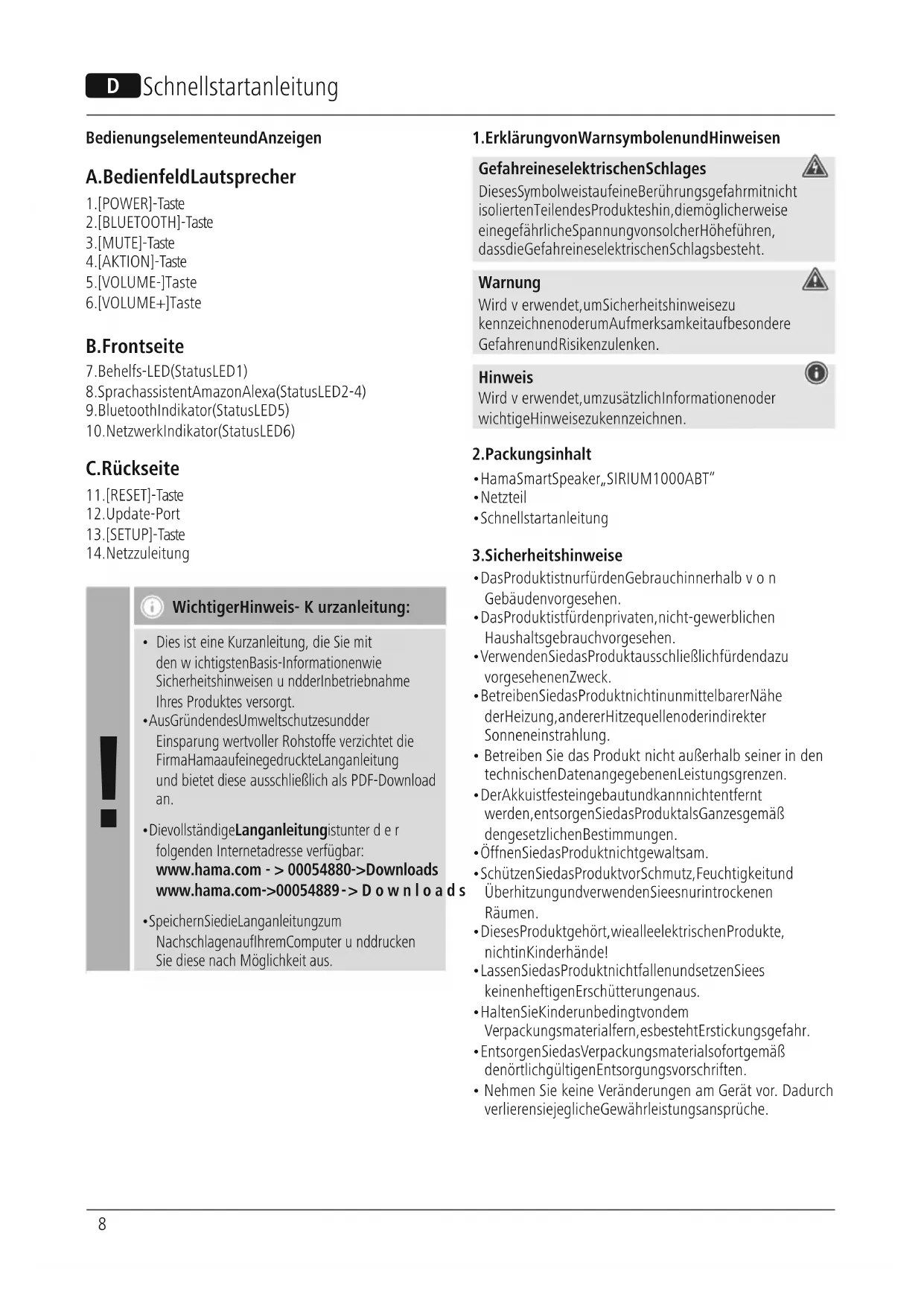 - Sollten Sie das Produkt längereZeit nicht nutzen, schalten Sie das Gerät aus und trennen es von der Stromversorgung. Lagern Sie es an einem sauberen, trockenen Ort ohne direkte Sonneneinstrahlung. 10.Haftungsausschluss Die Hama GmbH &CoKGübernimmt keinerlei Haftung oder Gewährleistung für Schäden, die aus unsachgemäßer Installation, Montage und unsachgemäßem Gebrauch des Produktes oder einer Nichtbeachtung der Bedienungsanleitung und/oder der Sicherheitshinweise resultieren. 11.Service und Support Bitte wenden Sie sich bei Fragen zum Produkt gerne an die Hama-Produktberatung. Hotline: +49 9091 502-115 (Deu/Eng) WeitereSupportinformationen nden sie hier: www.hama.com Die vollständige Langanleitung ist unter der folgenden Internetadresse verfügbar: www.hama.com -> 00054880 -> Downloads www.hama.com -> 00054889 -> Downloads13 12.Entsorgungshinweise Hinweis zum Umweltschutz: Ab dem Zeitpunkt der Umsetzung der europäischen Richtlinien 2012/19/EU und 2006/66/EG in nationales Recht gilt folgendes: Elektrische und elektronische Geräte sowie Batterien dürfen nicht mit dem Hausmüll entsorgt werden. Der Verbraucher ist gesetzlich verpichtet, elektrische und elektronische Geräte sowie Batterien am Ende ihrer Lebensdauer an den dafür eingerichteten, öffentlichen Sammelstellen oder an die Verkaufsstelle zurückzugeben. Einzelheiten dazu regelt das jeweilige Landesrecht. Das Symbol auf dem Produkt, der Gebrauchsanleitung oder der Verpackung weist auf diese Bestimmungen hin. Mit der Wiederverwertung, der stoichen Verwertung oder anderen Formen der Verwertung von Altgeräten/Batterien leisten Sie einen wichtigen Beitrag zum Schutz unserer Umwelt. 13.Konformitätserklärung Hiermit erklärt die Hama GmbH &CoKG, dass der Funkanlagentyp [00054880, 00054889] der Richtlinie 2014/53/EU entspricht. Der vollständige Text der EU-Konformitätserklärung ist unter der folgenden Internetadresse verfügbar: www.hama.com -> 00054880 -> Downloads. www.hama.com -> 00054889 -> Downloads. Frequenzband/ Frequenzbänder Bluetooth:2.402 GHz -2.480 GHz WiFi: 2.402GHz –2.480 GHz WiFi: 2.412GHz –2.483 GHz Abgestrahlte maximale Sendeleistung Bluetooth: 4dBm (EIRP) WiFi: 19.5 dBm (EIRP) 14.Angaben nach Verordnung (EU) 2019/1782 Handelsmarke, Handelsregisternummer, Anschrift Hama, HRA12159, Dresdner Str. 9, 86653 Monheim Modellkennung DYS618-120150 W-2 Eingangsspannung 100–240V Eingangswechselstrom- frequenz 50/60Hz Ausgangsspannung/ Ausgangsstrom/ Ausgangsleistung