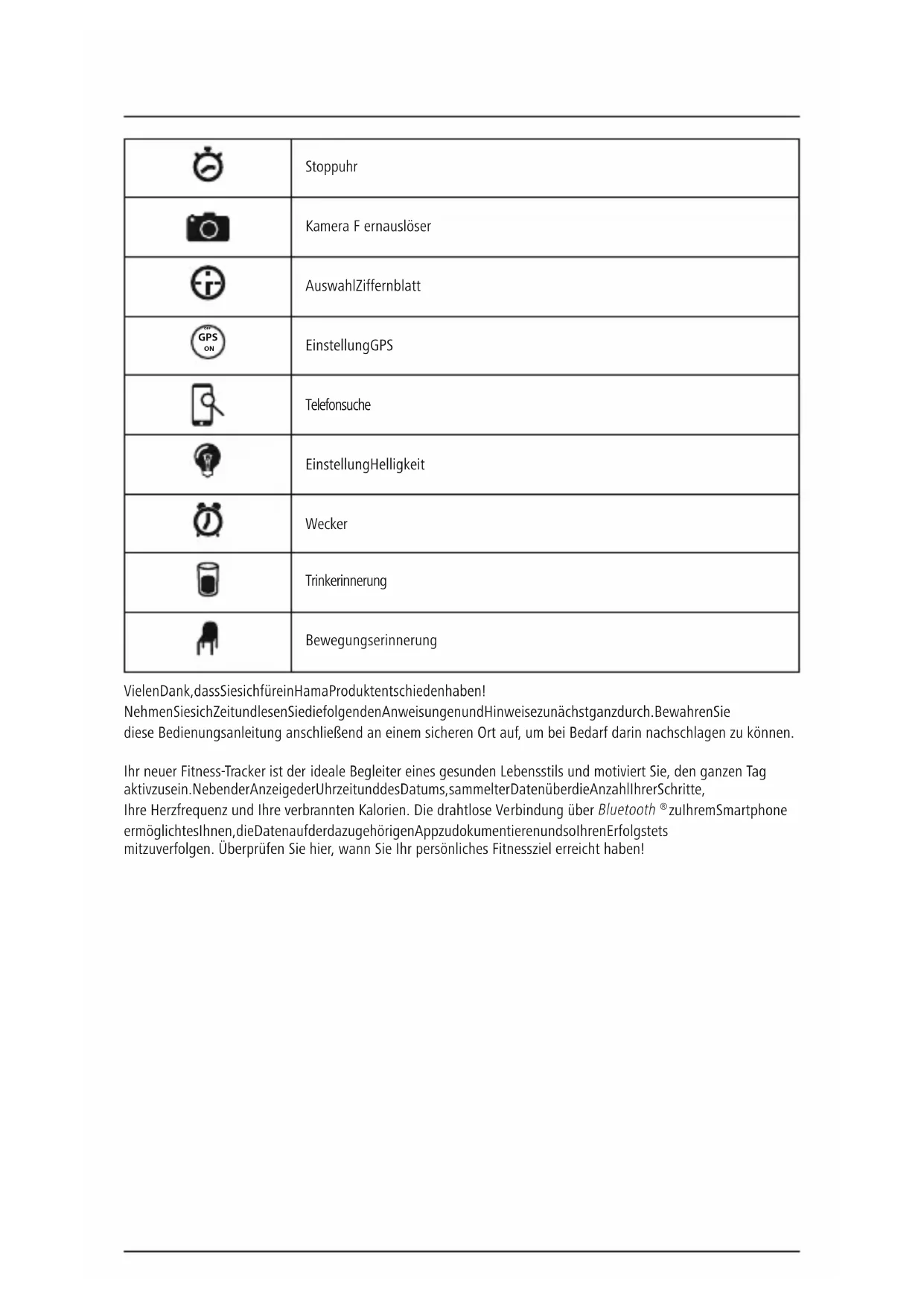 OFF Einstellung GPS Telefonsuche Einstellung Helligkeit Wecker Trinkerinnerung Bewegungserinnerung Vielen Dank, dass Sie sich für ein Hama Produkt entschieden haben! Nehmen Sie sich Zeit und lesen Sie die folgenden Anweisungen und Hinweise zunächst ganz durch. Bewahren Sie diese Bedienungsanleitung anschließend an einem sicheren Ort auf,umbei Bedarf darin nachschlagen zu können. Ihr neuer Fitness-Tracker ist der ideale Begleiter eines gesunden Lebensstils und motiviert Sie, den ganzen Tag aktiv zu sein. Neben der Anzeige der Uhrzeit und des Datums, sammelt er Daten über die Anzahl Ihrer Schritte, IhreHerzfrequenz und Ihreverbrannten Kalorien. Die drahtlose Verbindung über Bluetooth