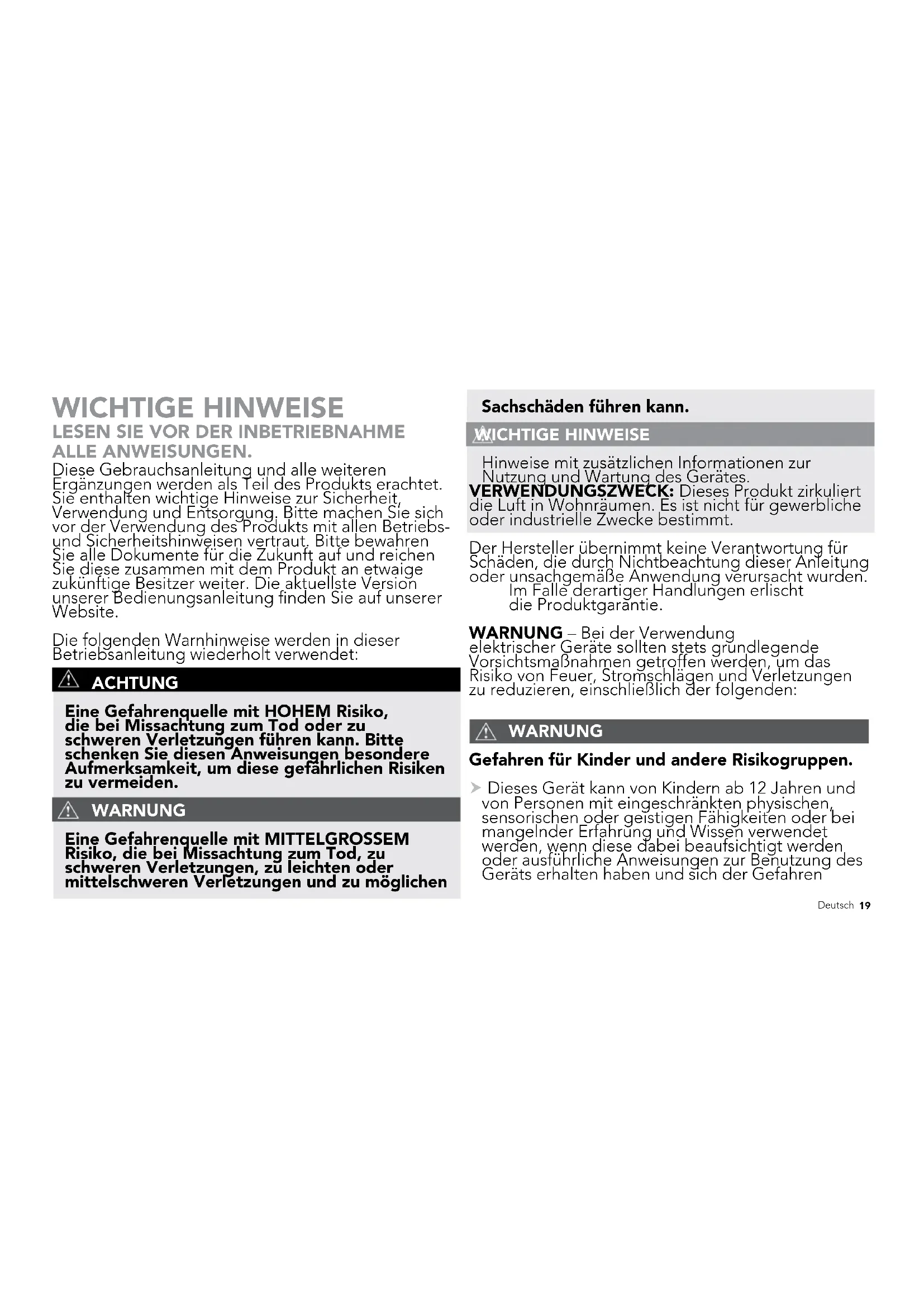 ALLE ANWEISUNGEN. Diese Gebrauchsanleitung und alle weiteren Ergänzungen werden als Teil des Produkts erachtet. Sie enthalten wichtige Hinweise zur Sicherheit, Verwendung und Entsorgung. Bitte machen Sie sich vor der Verwendung des Produkts mit allen Betriebs- und Sicherheitshinweisen vertraut. Bitte bewahren Sie alle Dokumente für die Zukunft auf und reichen Sie diese zusammen mit dem Produkt an etwaige zukünftige Besitzer weiter. Die aktuellste Version unserer Bedienungsanleitung nden Sie auf unserer Website. Die folgenden Warnhinweise werden in dieser Betriebsanleitung wiederholt verwendet: ACHTUNG Eine Gefahrenquelle mit HOHEM Risiko, die bei Missachtung zum Tod oder zu schweren Verletzungen führen kann. Bitte schenken Sie diesen Anweisungen besondere Aufmerksamkeit, um diese gefährlichen Risiken zu vermeiden. WARNUNG Eine Gefahrenquelle mit MITTELGROSSEM Risiko, die bei Missachtung zum Tod, zu schweren Verletzungen, zu leichten oder mittelschweren Verletzungen und zu möglichen Sachschäden führen kann. WICHTIGE HINWEISE Hinweise mit zusätzlichen Informationen zur Nutzung und Wartung des Gerätes. VERWENDUNGSZWECK: Dieses Produkt zirkuliert die Luft in Wohnräumen. Es ist nicht für gewerbliche oder industrielle Zwecke bestimmt. Der Hersteller übernimmt keine Verantwortung für Schäden, die durch Nichtbeachtung dieser Anleitung oder unsachgemäße Anwendung verursacht wurden. Im Falle derartiger Handlungen erlischt die Produktgarantie. WARNUNG – Bei der Verwendung elektrischer Geräte sollten stets grundlegende Vorsichtsmaßnahmen getroffen werden, um das Risiko von Feuer, Stromschlägen und Verletzungen zu reduzieren, einschließlich der folgenden: WARNUNG Gefahren für Kinder und andere Risikogruppen. Dieses Gerät kann von Kindern ab 12 Jahren und von Personen mit eingeschränkten physischen, sensorischen oder geistigen Fähigkeiten oder bei mangelnder Erfahrung und Wissen verwendet werden, wenn diese dabei beaufsichtigt werden oder ausführliche Anweisungen zur Benutzung des Geräts erhalten haben und sich der Gefahren20 Deutsch bewusst sind. Kinder dürfen nicht mit dem Gerät spielen. Das Gerät darf nicht von unbeaufsichtigten Kindern gewartet oder gereinigt werden. Das Gerät und die Verpackungsmaterialien sind kein Spielzeug und sollten außerhalb der Reichweite von Kindern aufbewahrt werden. WARNUNG Gefahr durch unsachgemäße Verwendung und Handhabung. Bitte befolgen Sie diese Richtlinien, um Risiken für Personen und Gegenstände zu vermeiden. Verwenden Sie dieses Produkt nicht im Freien oder in Bereichen, wo es der Witterung ausgesetzt ist. Verwenden Sie dieses Gerät nicht in feucht- tropischen Klimazonen. Wenn das Produkt aus der Kälte in einen warmen Raum gebracht wird (z. B. beim Transport), kann sich Kondenswasser im Gerät ansammeln. Warten Sie mit der Verwendung, bis das Gerät die Raumtemperatur erreicht hat. Verwenden Sie dieses Produkt nicht auf nassen Oberächen. Verwenden Sie dieses Produkt nicht in der Badewanne, in der Dusche oder an Orten, wo es in eine Badewanne, ein Waschbecken, ein Schwimmbad oder in andere Wasserbehälter fallen kann. Tauchen Sie das Gerät nicht in Wasser ein und lassen Sie kein Wasser in das Motorgehäuse tropfen. Verwenden Sie das Gerät nicht in der Nähe von Öfen, Kaminen oder anderen Hochtemperatur- Wärmequellen. Stellen Sie das Gerät nicht zu nah an Vorhängen auf, da diese in das hintere Gitter gezogen werden, den Luftstrom unterbrechen und den Motor beschädigen können. Tragen Sie das Gerät nicht an der Schnur und verwenden Sie das Kabel nicht als Griff, da dies die Elektronik im Gehäuseinneren beschädigen kann. Ziehen Sie das Gerät nicht am Kabel aus der Steckdose und belasten Sie das Kabel nicht. Ziehen Sie das Gerät am Stecker aus der Dose, nicht am Netzkabel. Verlegen Sie keine Netzkabel unter Teppichböden. Bedecken Sie Kabel nicht mit Teppichen, Läufern oder ähnlichen Abdeckungen. Verlegen Sie keine Netzkabel unter Möbeln oder Geräten. Verlegen Sie das Netzkabel fernab von Verkehrsächen, um Stolperunfälle zu vermeiden. Rollen Sie das Netzkabel auf, um eine Stolpergefahr zu vermeiden.