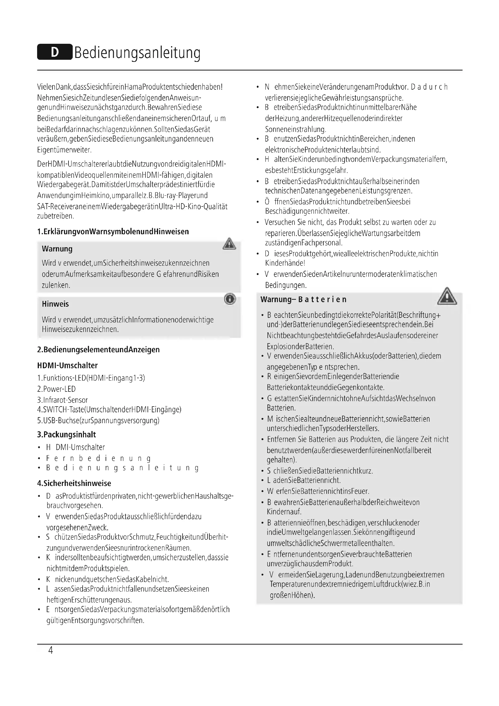Note on environmental protection: After the implementation of the European Directive 2012/19/EU and 2006/66/EU in the national legal system, the following applies: Electric and electronic devices as well as batteries must not be disposed of with household waste. Consumers areobliged by law to return electrical and electronic devices as well as batteries at the end of their service lives to the public collecting points set up for this purpose or point of sale. Details to this arede- ned by the national law of the respective country.This symbol on the product, the instruction manual or the package indicates that aproduct is subject to these regulations. By recycling, reusing the materials or other forms of utilising old devices/Batteries, you are making an important contribution to protecting our environment.4 D Bedienungsanleitung Vielen Dank, dass Sie sich für ein Hama Produkt entschieden haben! Nehmen Sie sich Zeit und lesen Sie die folgenden Anweisun- gen und Hinweise zunächst ganz durch. Bewahren Sie diese Bedienungsanleitung anschließend an einem sicheren Ort auf,um bei Bedarf darin nachschlagen zu können. Sollten Sie das Gerät veräußern, geben Sie diese Bedienungsanleitung an den neuen Eigentümer weiter. Der HDMI-Umschalter erlaubt die Nutzung von drei digitalen HDMI- kompatiblen Videoquellen mit einem HDMI-fähigen, digitalen Wiedergabegerät. Damit ist der Umschalter prädestiniert für die Anwendung im Heimkino, um parallel z.B. Blu-ray-Player und SAT-Receiver an einem Wiedergabegerät in Ultra-HD-Kino-Qualität zu betreiben.