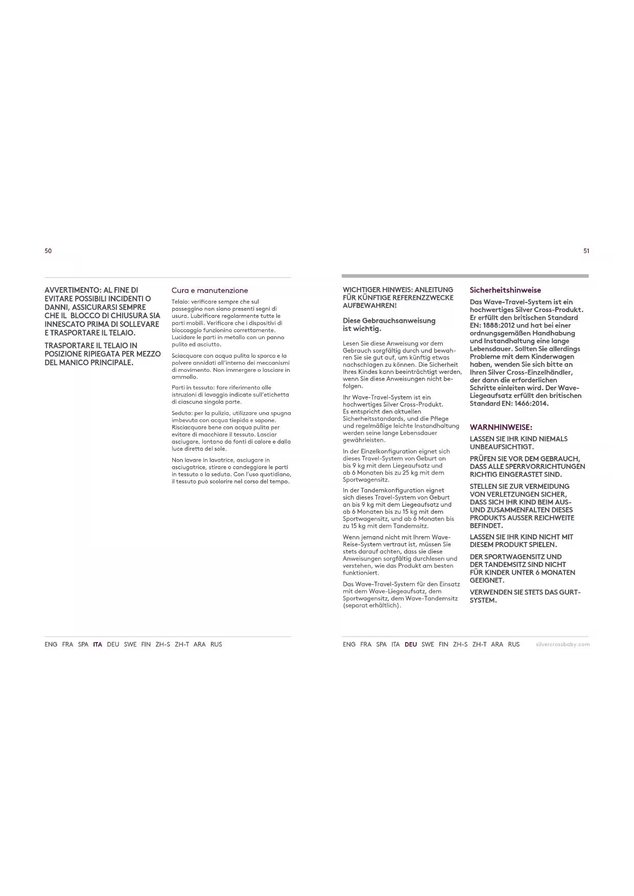 ODER HERAUSNEHMEN.54 55 silvercrossbaby.com ENG FRA SPA ITA DEU SWE FIN ZH-S ZH-T ARA RUS ENG FRA SPA ITA DEU SWE FIN ZH-S ZH-T ARA RUS Halten Sie beim Einstellen immer den Sitz fest. Stellen Sie sicher, dass die Feststellbremse betätigt wurde. Wenn beim Auf- oder Zusammenklappen des Buggys Probleme auftreten, gehen Sie nicht mit Gewalt vor. Andernfalls kann es zu Schäden kommen. Lesen Sie die Anweisungen zum Auf- und Zusammenklappen sorgfältig durch. Wenn Sie andere Zubehör- oder Ersatzteile als die von Silver Cross gelieferten oder empfohlenen anbringen, kann die Sicherheit nicht gewährleistet werden. Sollte eine andere Person dieses Produkt verwenden (beispielsweise Großeltern, Tagesmutter), weisen Sie sie bitte in den korrekten Gebrauch ein. Pege und Wartung Gestell – Prüfen Sie den Buggy immer auf Verschleißerscheinungen. Schmieren Sie alle beweglichen Teile regelmäßig. Prüfen Sie, ob alle Arretiervorrichtungen frei beweglich sind. Polieren Sie Metallteile mit einem sauberen, trockenen Tuch.Staub und Schmutz in beweglichen Teilen können mit klarem Wasser abgespült werden. Achten Sie darauf, dass der Buggy nicht durchnässt oder in Wasser getaucht wird. Stoteile – Bitte lesen Sie die Waschanleitung auf den Pegeetiketten der einzelnen Teile. Sitz – Reinigen Sie den Sitzbereich mit einem Schwamm und warmer Seifenlauge. Spülen Sie mit klarem Wasser gut nach, damit keine Flecken zurückbleiben. Lassen Sie es den Sitz ohne direkte Hitze und starke Sonneneinstrahlung trocknen. Waschen Sie die Stobezüge und den Sitz auf keinen Fall in der Waschmaschine, geben Sie sie nicht in den Trockner und bügeln oder bleichen Sie sie nicht. Bei täglichem Gebrauch können die Farben im Lauf der Zeit etwas ausbleichen.