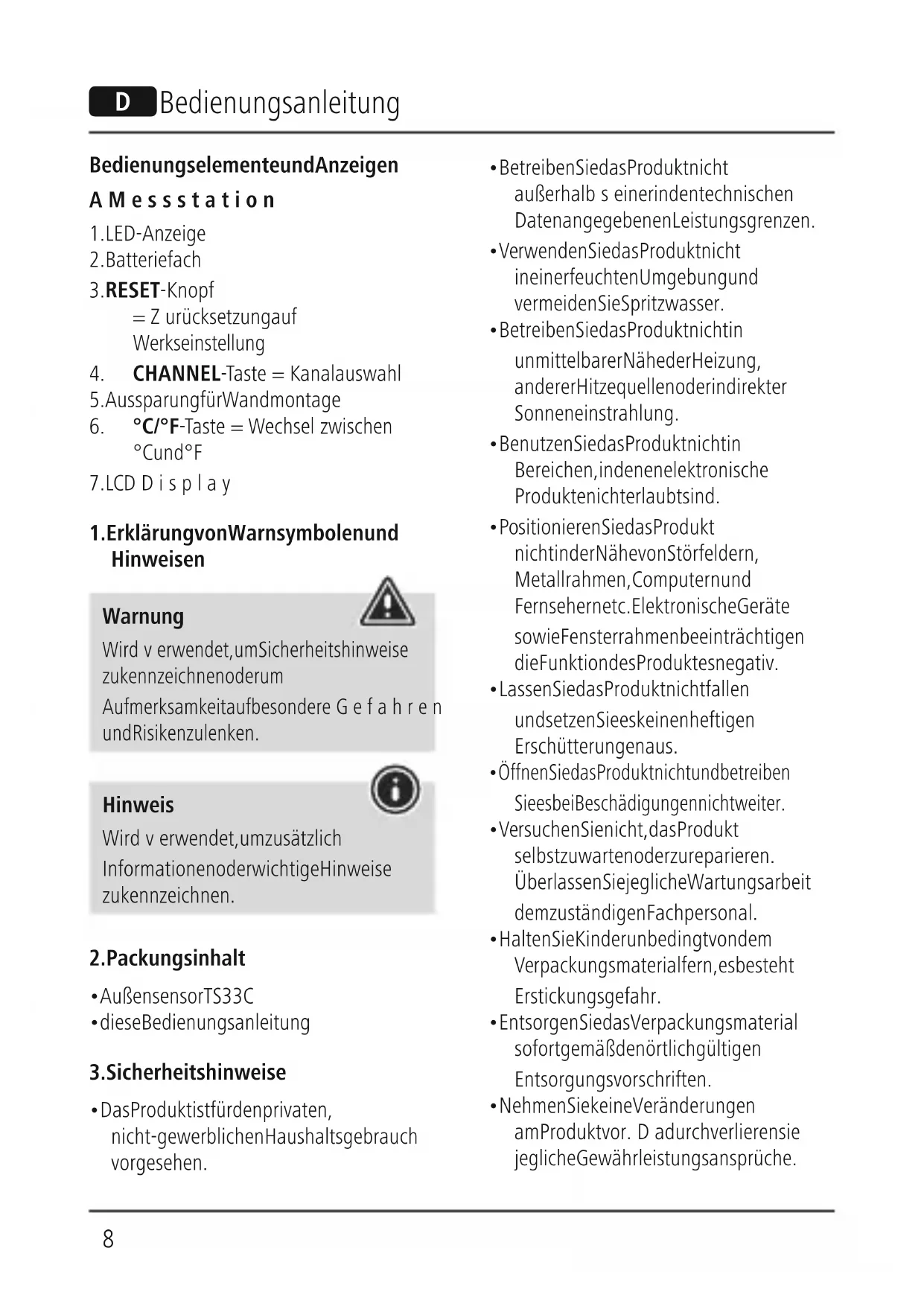 - Nehmen Sie keine Veränderungen am Produkt vor.Dadurch verlieren sie jegliche Gewährleistungsansprüche. D Bedienungsanleitung9