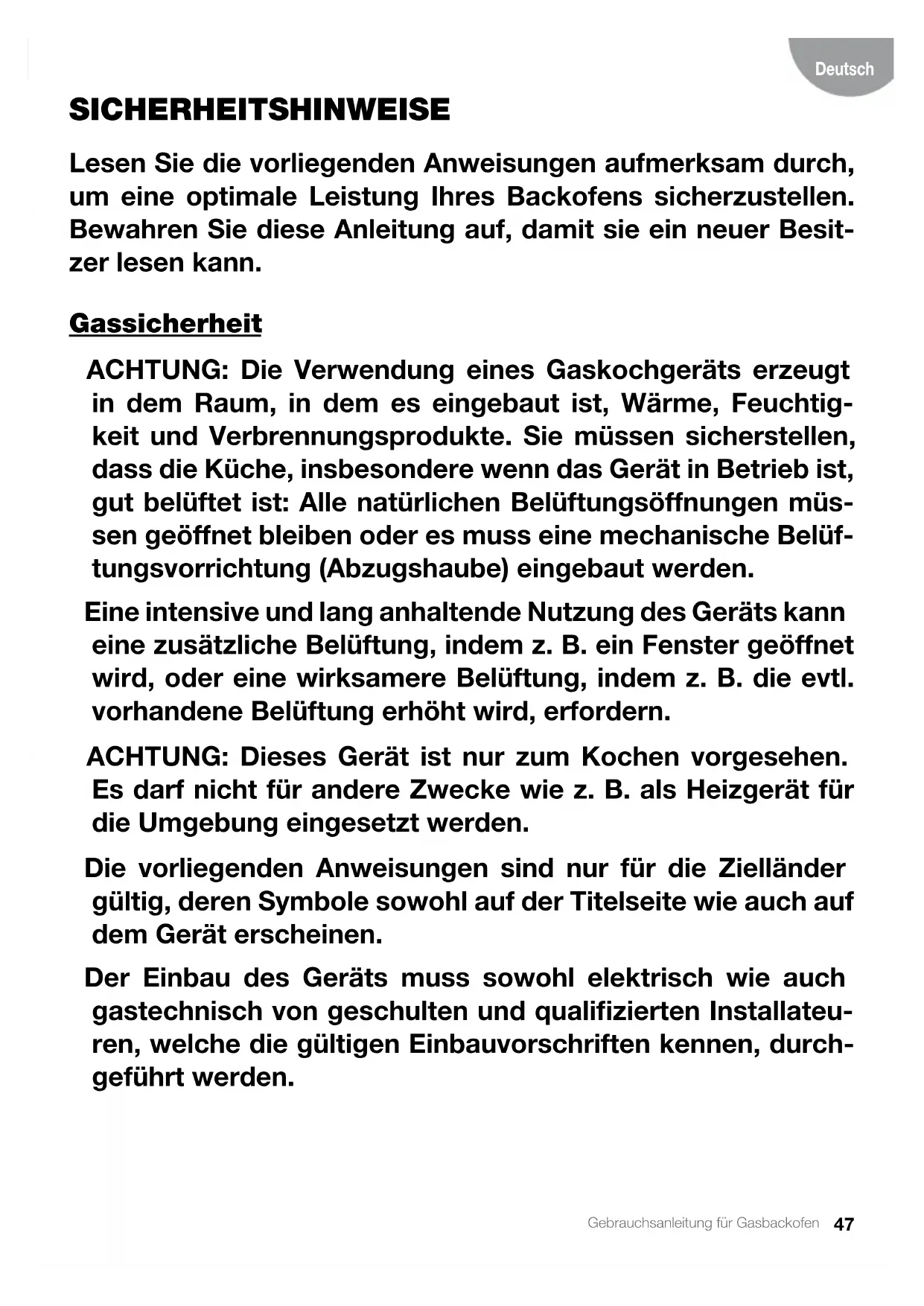 - Dieses Gerät ist zum Kochen und Aufwärmen von Lebens- mitteln bestimmt und darf nicht für andere Verwendungs- zwecke eingesetzt werden.49 Gebrauchsanleitung für Gasbackofen Deutsch Elektrische Sicherheit