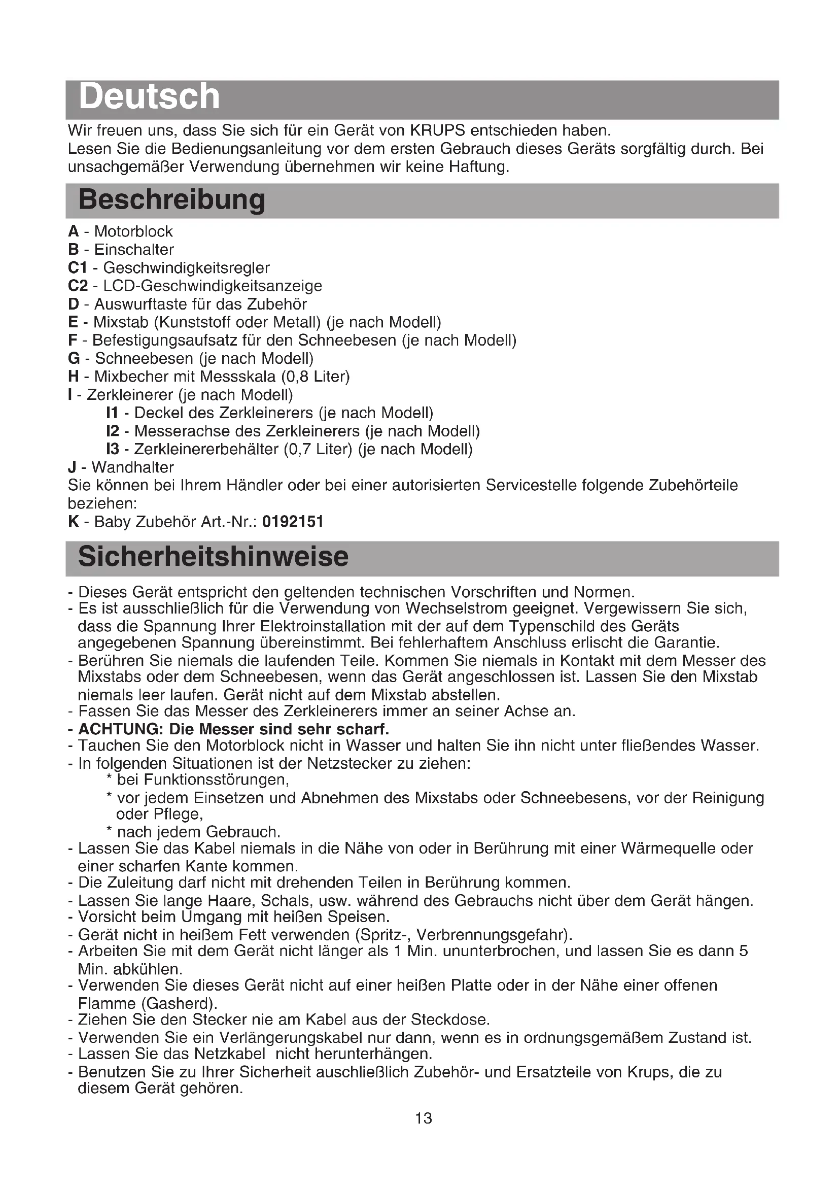 - nach jedem Gebrauch. - Lassen Sie das Kabel niemals in die Nähe von oder in Berührung mit einer Wärmequelle oder einer scharfen Kante kommen. - Die Zuleitung darf nicht mit drehenden Teilen in Berührung kommen. - Lassen Sie lange Haare, Schals, usw. während des Gebrauchs nicht über dem Gerät hängen. - Vorsicht beim Umgang mit heißen Speisen. - Gerät nicht in heißem Fett verwenden (Spritz-, Verbrennungsgefahr). - Arbeiten Sie mit dem Gerät nicht länger als 1 Min. ununterbrochen, und lassen Sie es dann 5 Min. abkühlen. - Verwenden Sie dieses Gerät nicht auf einer heißen Platte oder in der Nähe einer offenen Flamme (Gasherd). - Ziehen Sie den Stecker nie am Kabel aus der Steckdose. - Verwenden Sie ein Verlängerungskabel nur dann, wenn es in ordnungsgemäßem Zustand ist. - Lassen Sie das Netzkabel nicht herunterhängen. - Benutzen Sie zu Ihrer Sicherheit auschließlich Zubehör- und Ersatzteile von Krups, die zu diesem Gerät gehören. hanovre 2544615 6/04/06 14:33 Page 1314 - Falls das Netzkabel beschädigt ist, muss es aus Sicherheitsgründen von einer vom Hersteller autorisierten Servicestelle (Liste anbei) ersetzt werden. - Ein Elektrogerät darf nicht in Betrieb genommen werden, wenn: