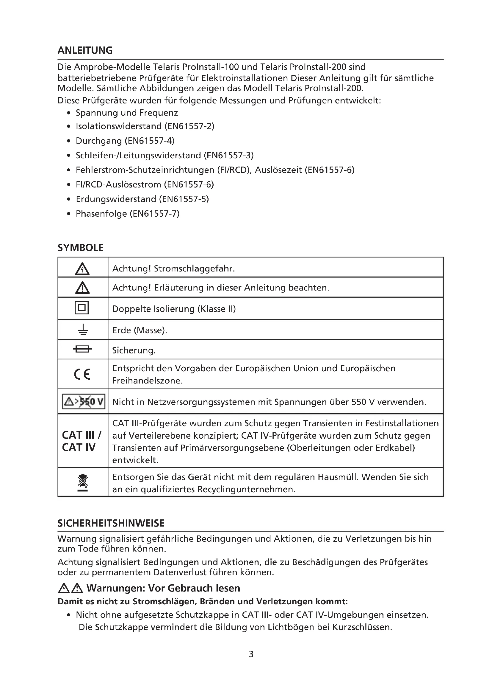 ANLEITUNGDie Amprobe-Modelle Telaris ProInstall-100 und Telaris ProInstall-200 sind batteriebetriebene Prüfgeräte für Elektroinstallationen Dieser Anleitung gilt für sämtliche Modelle. Sämtliche Abbildungen zeigen das Modell Telaris ProInstall-200.Diese Prüfgeräte wurden für folgende Messungen und Prüfungen entwickelt:• Spannung und Frequenz• Isolationswiderstand (EN61557-2)• Durchgang (EN61557-4)• Schleifen-/Leitungswiderstand (EN61557-3)• Fehlerstrom-Schutzeinrichtungen (FI/RCD), Auslösezeit (EN61557-6)• FI/RCD-Auslösestrom (EN61557-6)• Erdungswiderstand (EN61557-5)• Phasenfolge (EN61557-7)SYMBOLE Achtung! Stromschlaggefahr. Achtung! Erläuterung in dieser Anleitung beachten. Doppelte Isolierung (Klasse II) Erde (Masse). Sicherung. Entspricht den Vorgaben der Europäischen Union und Europäischen Freihandelszone.Nicht in Netzversorgungssystemen mit Spannungen über 550 V verwenden.CAT III / CAT IVCAT III-Prüfgeräte wurden zum Schutz gegen Transienten in Festinstallationen auf Verteilerebene konzipiert; CAT IV-Prüfgeräte wurden zum Schutz gegen Transienten auf Primärversorgungsebene (Oberleitungen oder Erdkabel) entwickelt. Entsorgen Sie das Gerät nicht mit dem regulären Hausmüll. Wenden Sie sich an ein qualifiziertes Recyclingunternehmen.SICHERHEITSHINWEISEWarnung signalisiert gefährliche Bedingungen und Aktionen, die zu Verletzungen bis hin zum Tode führen können.Achtung signalisiert Bedingungen und Aktionen, die zu Beschädigungen des Prüfgerätes oder zu permanentem Datenverlust führen können. W Warnungen: Vor Gebrauch lesen Damit es nicht zu Stromschlägen, Bränden und Verletzungen kommt:• Nicht ohne aufgesetzte Schutzkappe in CAT III- oder CAT IV-Umgebungen einsetzen. Die Schutzkappe vermindert die Bildung von Lichtbögen bei Kurzschlüssen.4