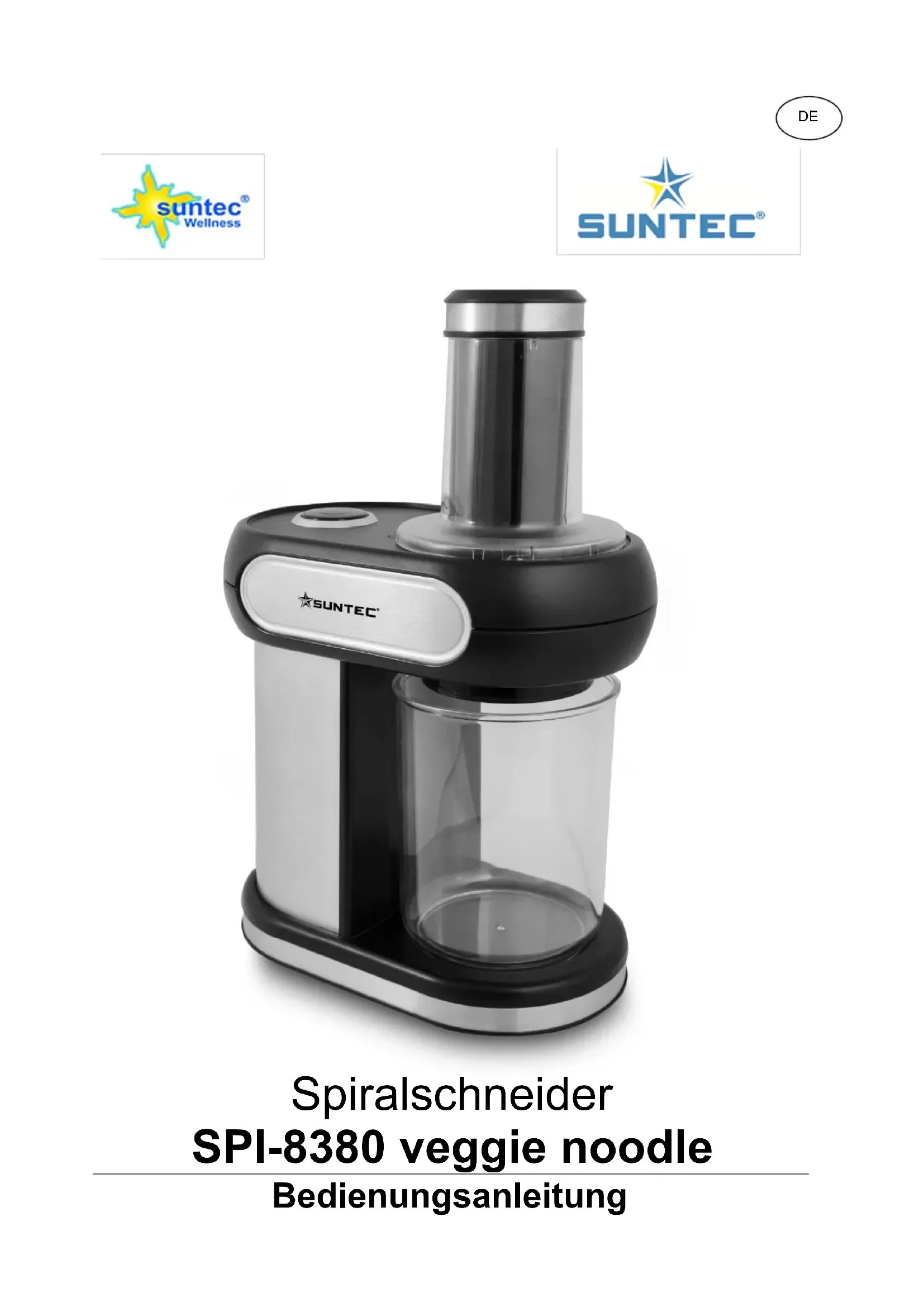 Spiralschneider SPI-8380 veggie noodle BedienungsanleitungWir danken Ihnen für den Kauf dieses Gerätes der Marke Suntec Wellness. Bitte lesen Sie die Bedienungsanleitung aufmerksam, bevor Sie das Gerät in Betrieb nehmen. Bitte bewahren Sie diese Bedienungsanleitung zum späteren Nachschlagen auf. Sicherheitshinweise VORSICHT! Dieses Gerät kann von Kindern ab 8 Jahren und darüber und von Personen mit reduzierten physischen, sensorischen oder mentalen Fähigkeiten oder Mangel an Erfahrung und/oder Wissen benutzt werden, wenn sie beaufsichtigt oder bezüglich des sicheren Gebrauchs des Gerätes unterwiesen wurden und die daraus resultierenden Gefahren verstanden haben. Kinder dürfen nicht mit dem Gerät spielen. Reinigung und Benutzer-Wartung dürfen nicht durch Kinder ohne Beaufsichtigung durchgeführt werden.