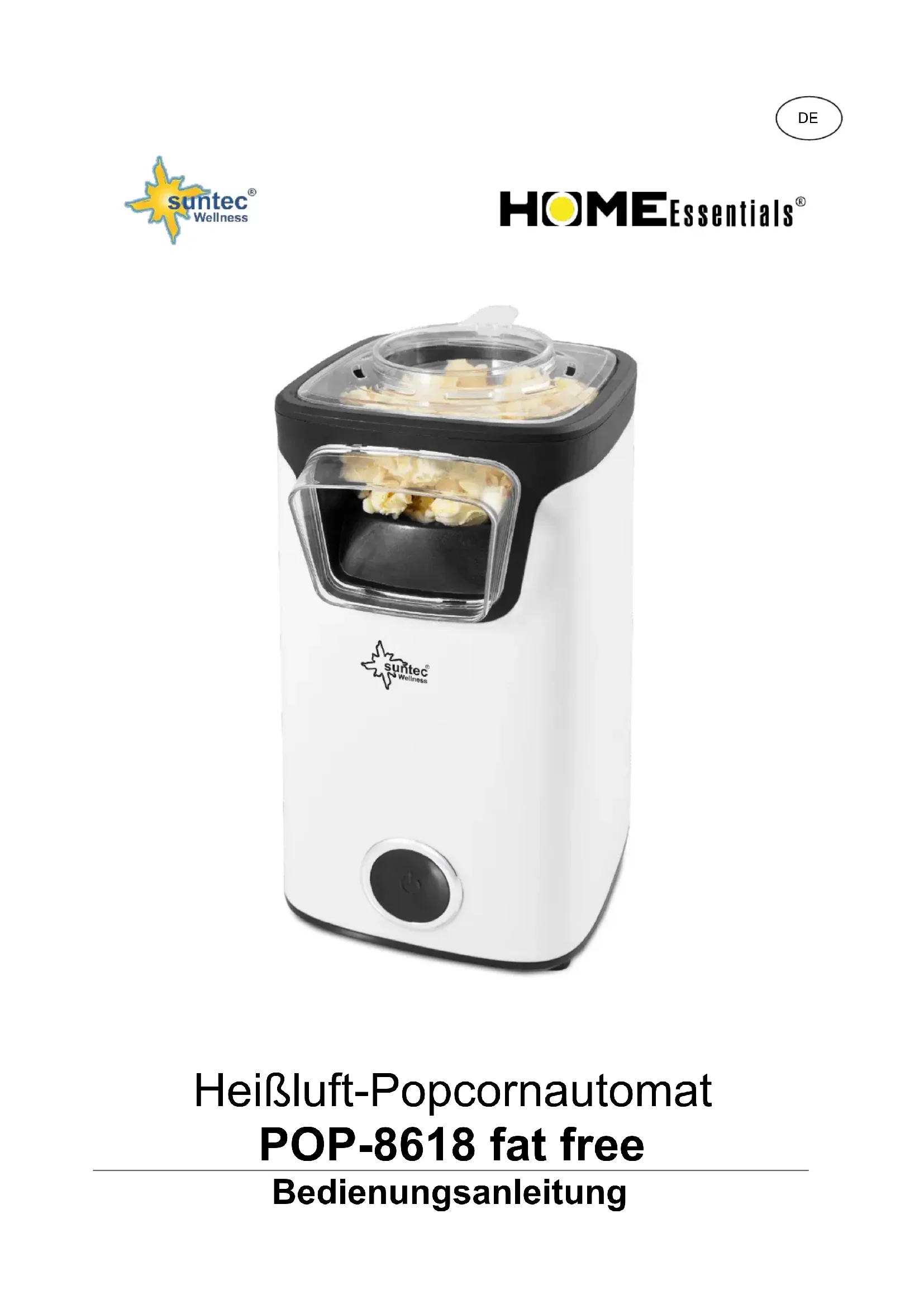 Heißluft-Popcornautomat POP-8618 fat free BedienungsanleitungWir danken Ihnen für den Kauf dieses Gerätes der Marke Suntec Wellness. Bitte lesen Sie die Bedienungsanleitung aufmerksam, bevor Sie das Gerät in Betrieb nehmen. Bitte bewahren Sie diese Bedienungsanleitung zum späteren Nachschlagen auf. Sicherheitshinweise VORSICHT! Dieses Gerät kann von Kindern ab 8 Jahren und darüber und von Personen mit reduzierten physischen, sensorischen oder mentalen Fähigkeiten oder Mangel an Erfahrung und/oder Wissen benutzt werden, wenn sie beaufsichtigt oder bezüglich des sicheren Gebrauchs des Gerätes unterwiesen wurden und die daraus resultierenden Gefahren verstanden haben. Kinder dürfen nicht mit dem Gerät spielen. Reinigung und Benutzer-Wartung dürfen nicht durch Kinder ohne Beaufsichtigung durchgeführt werden. Kinder unter 3 Jahren ohne permanente Aufsicht müssen daran gehindert werden, auf das Gerät zugreifen zu können. Kinder ab 3 Jahren und unter 8 Jahren dürfen das Gerät nur unter der Voraussetzung ein- und ausschalten, dass das Gerät in seiner vorgesehenen Gebrauchslage positioniert oder installiert, sie bezüglich des sicheren Gebrauchs des Gerätes unterwiesen und beaufsichtigt werden und die möglichen Gefahren verstanden haben. Kinder ab 3 Jahren und unter 8 Jahren dürfen das Gerät nicht an die Steckdose anschließen, es regulieren, reinigen oder die Wartung durchführen.