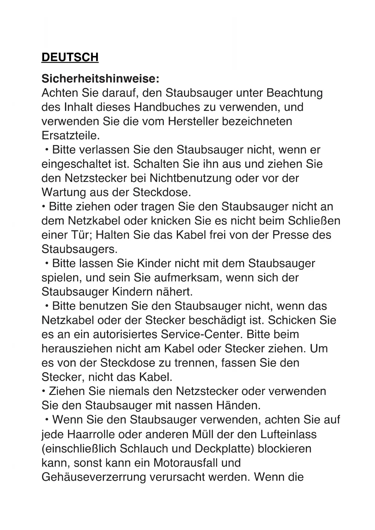 - Wenn Sie den Staubsauger verwenden, achten Sie auf jede Haarrolle oder anderen Müll der den Lufteinlass (einschließlich Schlauch und Deckplatte) blockieren kann, sonst kann ein Motorausfall und Gehäuseverzerrung verursacht werden. Wenn dieSicherheitshinweise Sachen gesaugt werden und eine Blockade verursachen, stoppen Sie sofort den Staubsauger durch Herausziehen des Netzsteckers, um die Blockade zu reinigen.