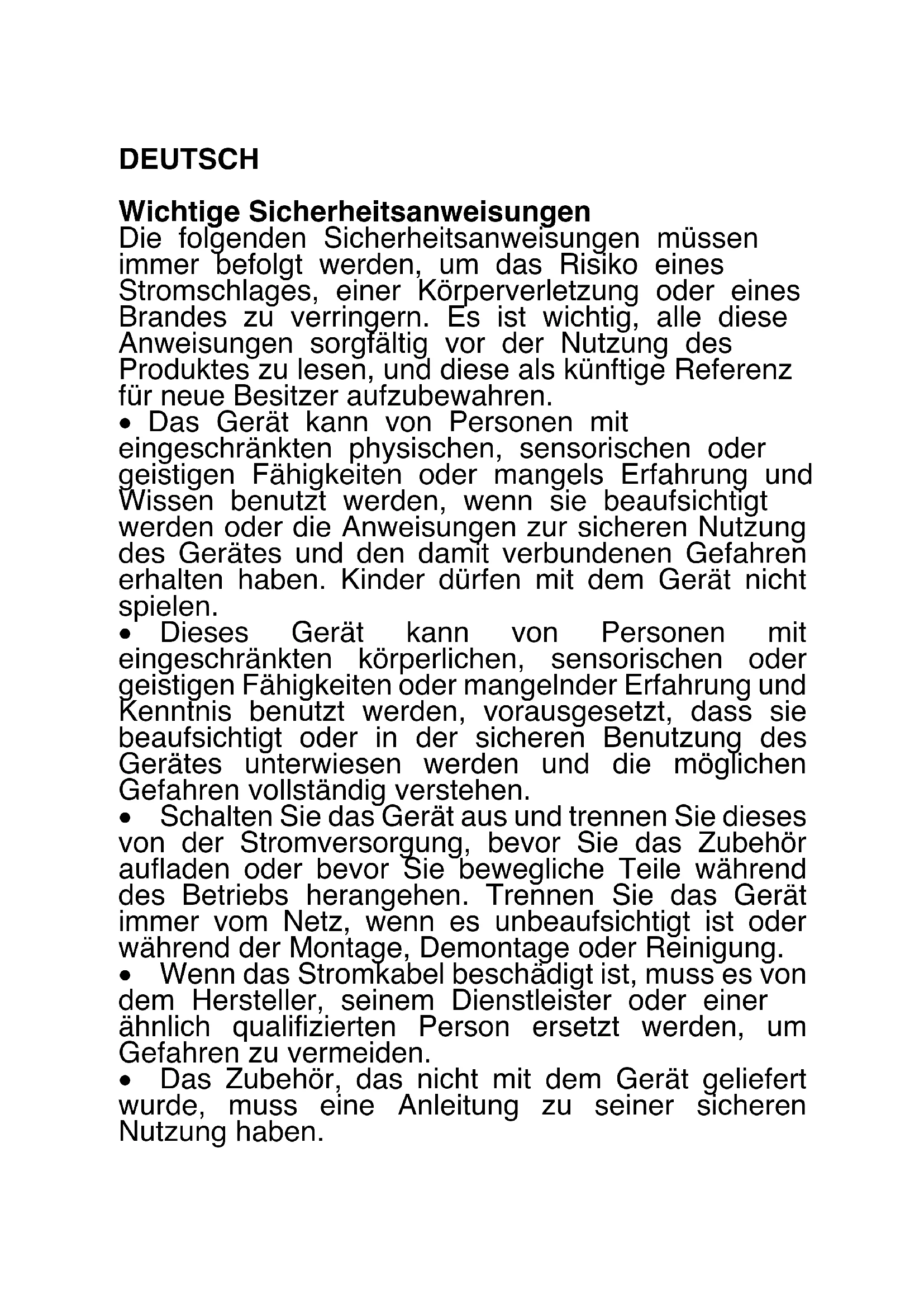 - Die Reinigung und Wartung dürfen nicht von Kindern durchgeführt werden, es sei den sie sind über 8 Jahre alt und werden von einem Erwachsenen beaufsichtigt.