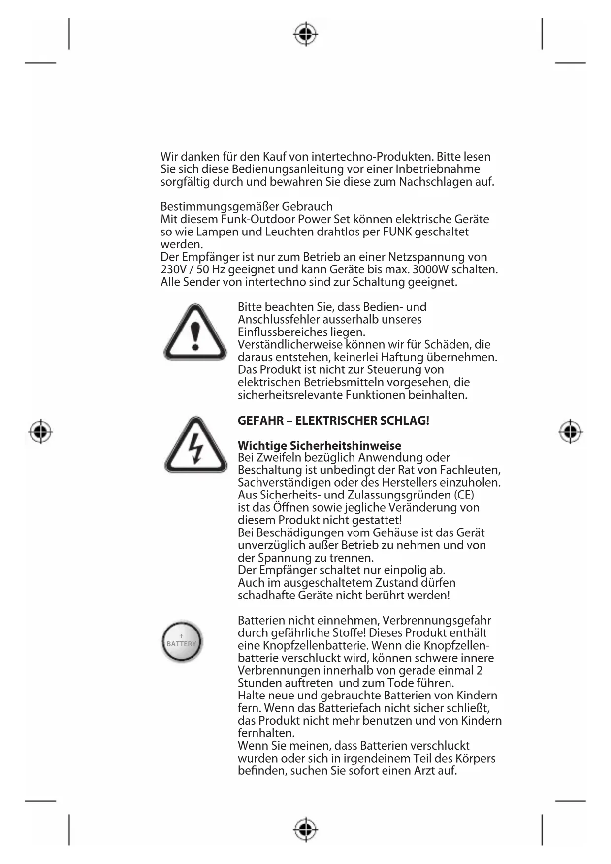 Funk-Technik GmbHseit 1970 D Bedienungsanleitung BG Ръководство за обслужване CZ Návod k obsluze DK Betjeningsvejledning E Manual de instrucciones EST Kasutusjuhend F Mode d’emploi FIN Käyttöohje GB Operating instructions GR Οδηγίες χρήσης H Kezelési utasítás HR Uputa za rukovanje I Istruzioni d’uso ISL Notkunarleiðbeiningar N Bruksanvisning NL Bedieningshandleiding P Manual de instruções PL Instrukcja obsługi R Руководство по эксплуатации RO Instrucţiuni de utilizare S Bruksanvisning SK Návod na obsluhu SLO Navodila za uporabo TR Kullanma kılavuzuWir danken für den Kauf von intertechno-Produkten. Bitte lesen Sie sich diese Bedienungsanleitung vor einer Inbetriebnahme sorgfältig durch und bewahren Sie diese zum Nachschlagen auf. Bestimmungsgemäßer Gebrauch Mit diesem Funk-Outdoor Power Set können elektrische Geräte so wie Lampen und Leuchten drahtlos per FUNK geschaltet werden. Der Empfänger ist nur zum Betrieb an einer Netzspannung von 230V / 50 Hz geeignet und kann Geräte bis max. 3000W schalten. Alle Sender von intertechno sind zur Schaltung geeignet. Bitte beachten Sie, dass Bedien- und Anschlussfehler ausserhalb unseres Einflussbereiches liegen. Verständlicherweise können wir für Schäden, die daraus entstehen, keinerlei Haftung übernehmen. Das Produkt ist nicht zur Steuerung von elektrischen Betriebsmitteln vorgesehen, die sicherheitsrelevante Funktionen beinhalten. GEFAHR – ELEKTRISCHER SCHLAG! Wichtige Sicherheitshinweise Bei Zweifeln bezüglich Anwendung oder Beschaltung ist unbedingt der Rat von Fachleuten, Sachverständigen oder des Herstellers einzuholen. Aus Sicherheits- und Zulassungsgründen (CE) ist das Öffnen sowie jegliche Veränderung von diesem Produkt nicht gestattet! Bei Beschädigungen vom Gehäuse ist das Gerät unverzüglich außer Betrieb zu nehmen und von der Spannung zu trennen. Der Empfänger schaltet nur einpolig ab. Auch im ausgeschaltetem Zustand dürfen schadhafte Geräte nicht berührt werden! Batterien nicht einnehmen, Verbrennungsgefahr durch gefährliche Stoffe! Dieses Produkt enthält eine Knopfzellenbatterie. Wenn die Knopfzellen- batterie verschluckt wird, können schwere innere Verbrennungen innerhalb von gerade einmal 2 Stunden auftreten und zum Tode führen. Halte neue und gebrauchte Batterien von Kindern fern. Wenn das Batteriefach nicht sicher schließt, das Produkt nicht mehr benutzen und von Kindern fernhalten. Wenn Sie meinen, dass Batterien verschluckt wurden oder sich in irgendeinem Teil des Körpers befinden, suchen Sie sofort einen Arzt auf.