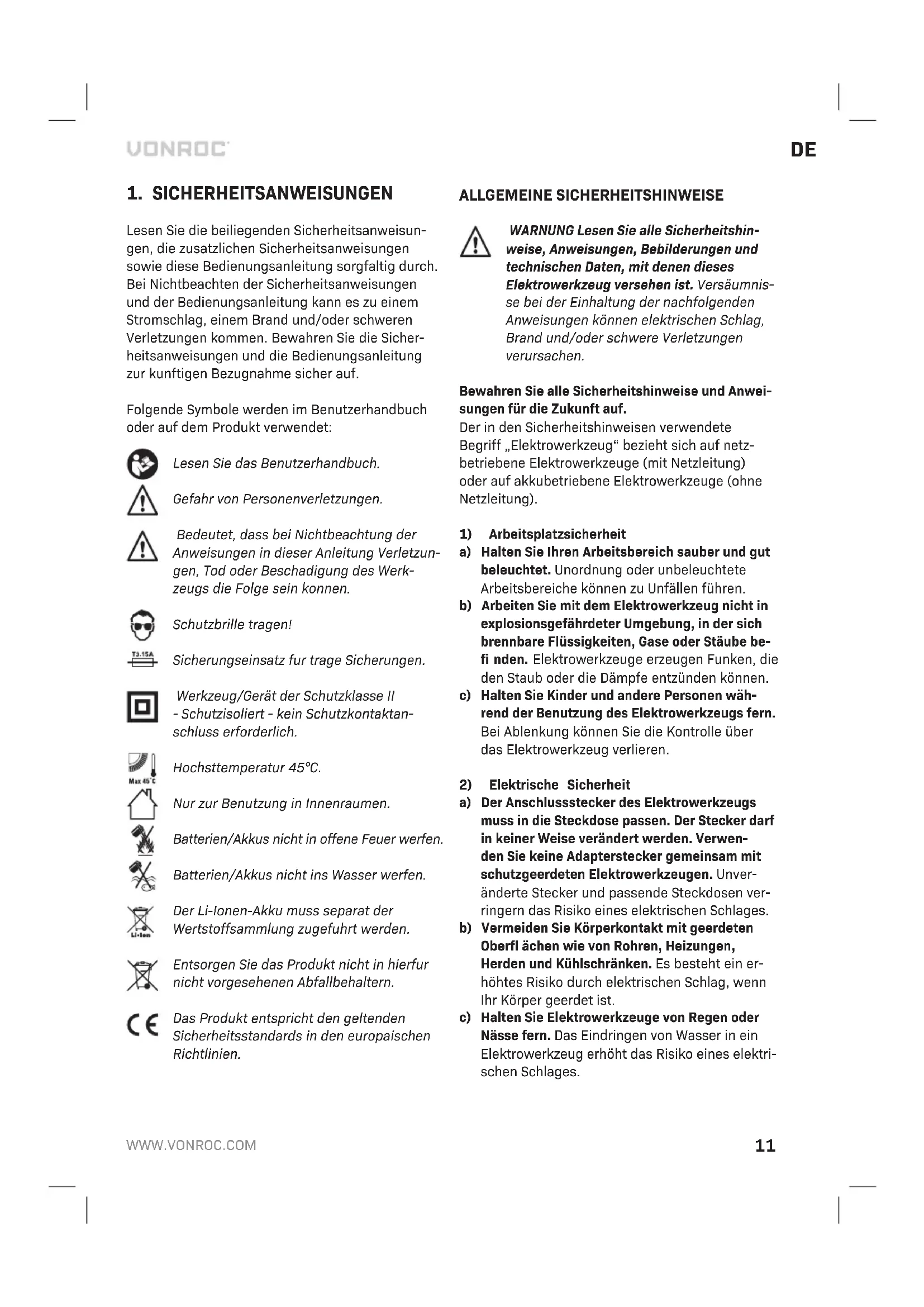 a) Offnen Sie den Akku nicht. Es besteht die Ge- fahr eines Kurzschlusses. b) Schutzen Sie den Akku vor Hitze, z. B. auch vor dauernder Sonneneinstrahlung, Feuer, Wasser und Feuchtigkeit. Es besteht Explosionsgefahr. c) Bei Beschadigung und unsachgemasem Ge- brauch des Akkus konnen Dampfe austreten. Fuhren Sie Frisch luft zu und suchen Sie bei Be- schwerden einen Arzt auf. Die Dampfe konnen die Atemwege reizen. d) Verwenden Sie den Akku nur in Verbindung mit Ihrem Vonroc Produkt. Nur so wird der Akku vor gefahrlicher Uberlastung geschutzt. e) Durch spitze Gegenstande wie z. B. Nagel oder Schrau benzieher oder durch ausere Kraftein- wirkung kann der Akku beschadigt werden. Es kann zu einem internen Kurzschluss kommen und der Akku brennen, rauchen, ex plodieren oder uberhitzen.