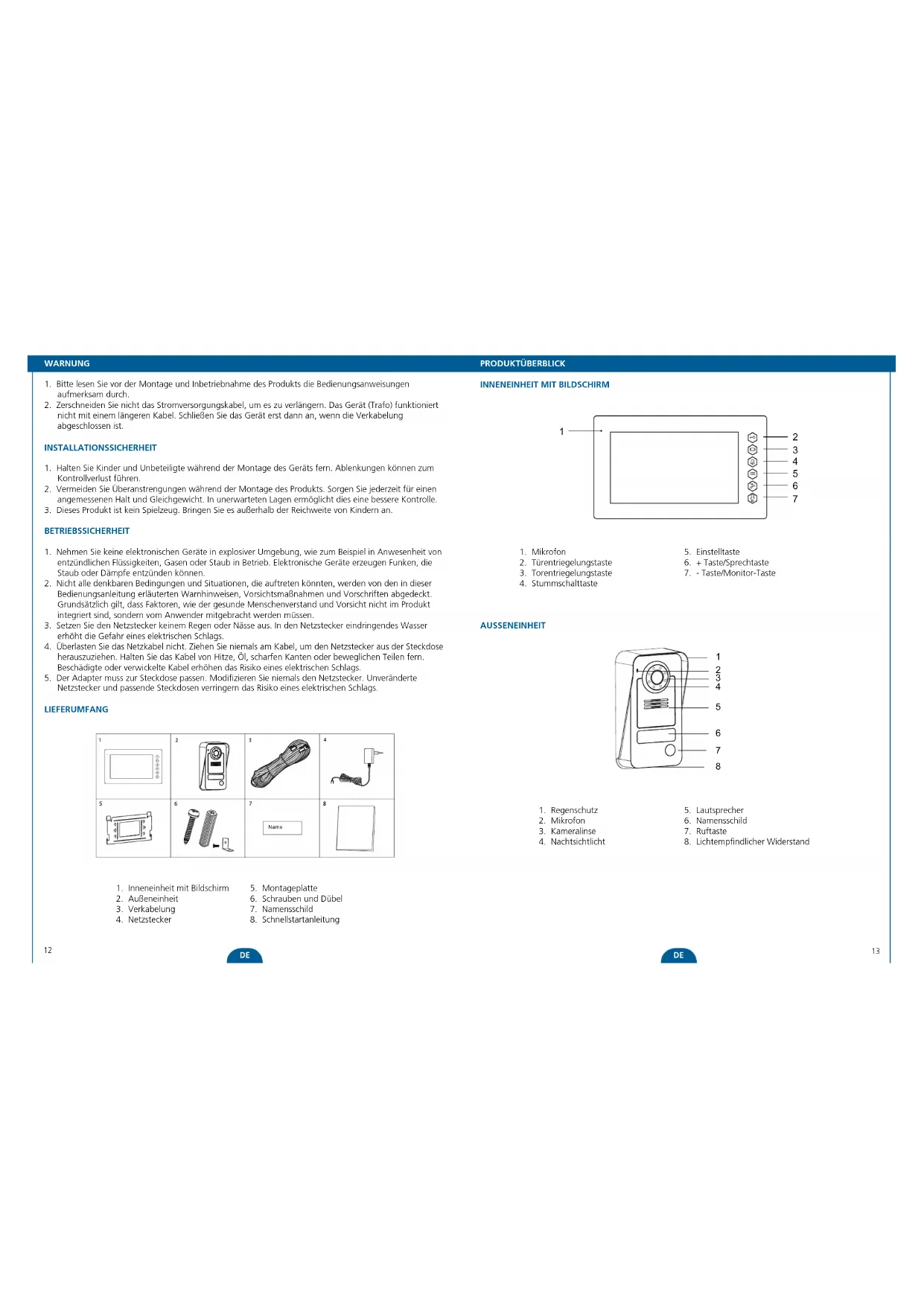 Netzspannung DC 15 V 1 A Farbkonfiguration RGB Delta Videosystem PAL/NTSC Effektive Auflösung 800x3 (RGB) x480 Stromaufnahme 500 ± 100 mA Betriebstemperatur -5°C ~ +50°C Betriebsfeuchtigkeit 85 % (Max) Bildschirmgröße 7 Zoll (diagonal) AUSSENKAMERA Bildsensor-Typ 1/4 Zoll CMOS Betrachtungswinkel Etwa 70 Grad Energieversorgung Inneneinheit mit Bildschirm Nachtsichtreichweite 0,5 m ~ 1 m Stromaufnahme 200~250 mA Betriebstemperatur -10°C ~ +50°C Lagertemperatur -20°C ~ +60°C Betriebsfeuchtigkeit ≤85% RH SICHERHEITSHINWEISE Vorsichtsmaßnahmen Bedecken Sie die Lüftungsöffnungen nicht mit Objekten wie Zeitungen, Tischdecken, Vorhängen usw. Lassen Sie dieses Produkt nicht in direkten Kontakt mit Wärmequellen oder offenen Flammen kommen. Durch starke elektromagnetische Interferenzen kann der Normalbetrieb des Produkts gestört werden. Dieses Gerät ist ausschließlich für den Heimgebrauch bestimmt. Dieses Gerät darf keinen Wasserspritzern ausgesetzt sein oder in Wasser getaucht werden. Es dürfen keine mit Flüssigkeit gefüllten Gefäße wie Vasen auf das Gerät gestellt werden. Halten Sie einen Sicherheitsabstand von mindestens 10 cm um das Produkt ein, damit für eine ausreichende Belüftung gesorgt ist. Vergewissern Sie sich, dass die Außeneinheit nicht dort installiert ist, wo sie Wasser oder Regen ausgesetzt sein könnte. Lassen Sie Kinder mit diesem Gerät nicht spielen. Entspricht allen relevanten Europäischen Richtlinien.Dieses Symbol ist bekannt als ‘Symbol der durchgestrichenen Mülltonne’. Wenn dieses Symbol auf einem Produkt oder einer Batterie markiert ist, bedeutet das, dass es nicht mit Ihrem allgemeinen Haushaltsmüll entsorgt werden sollte. Einige Chemikalien, die in elektrischen/elektronischen Produkten oder Batterien enthalten sind können der Gesundheit und der Umwelt schaden. Entsorgen Sie elektrische/elektronische/Batterie-Geräte in separaten Sammelmodellen, die für die Rückgewinnung und das Recycling von darin enthaltenen Materialien sorgen. Ihre Zusammenarbeit ist wichtig, um den Erfolg dieser Sammelmodelle zu sichern und für den Schutz der Umwelt. DEName
