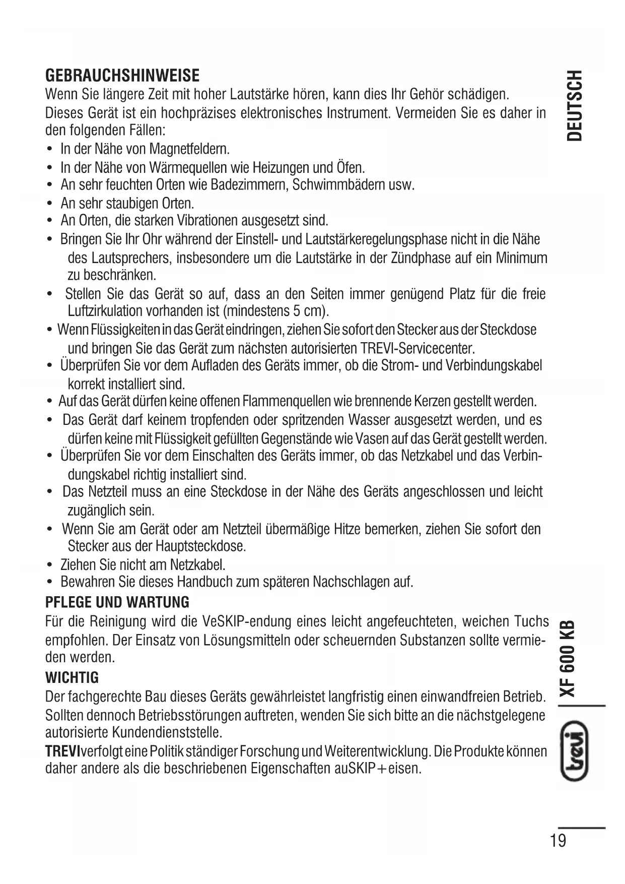 Für die Reinigung wird die VeSKIP-endung eines leicht angefeuchteten, weichen Tuchs empfohlen. Der Einsatz von Lösungsmitteln oder scheuernden Substanzen sollte vermie- den werden. WICHTIG Der fachgerechte Bau dieses Geräts gewährleistet langfristig einen einwandfreien Betrieb. Sollten dennoch Betriebsstörungen auftreten, wenden Sie sich bitte an die nächstgelegene autorisierte Kundendienststelle. TREVIverfolgt eine Politik ständiger Forschung und Weiterentwicklung. Die Produkte können daher andere als die beschriebenen Eigenschaften auSKIP+eisen. DEUTSCHXF 600 KB