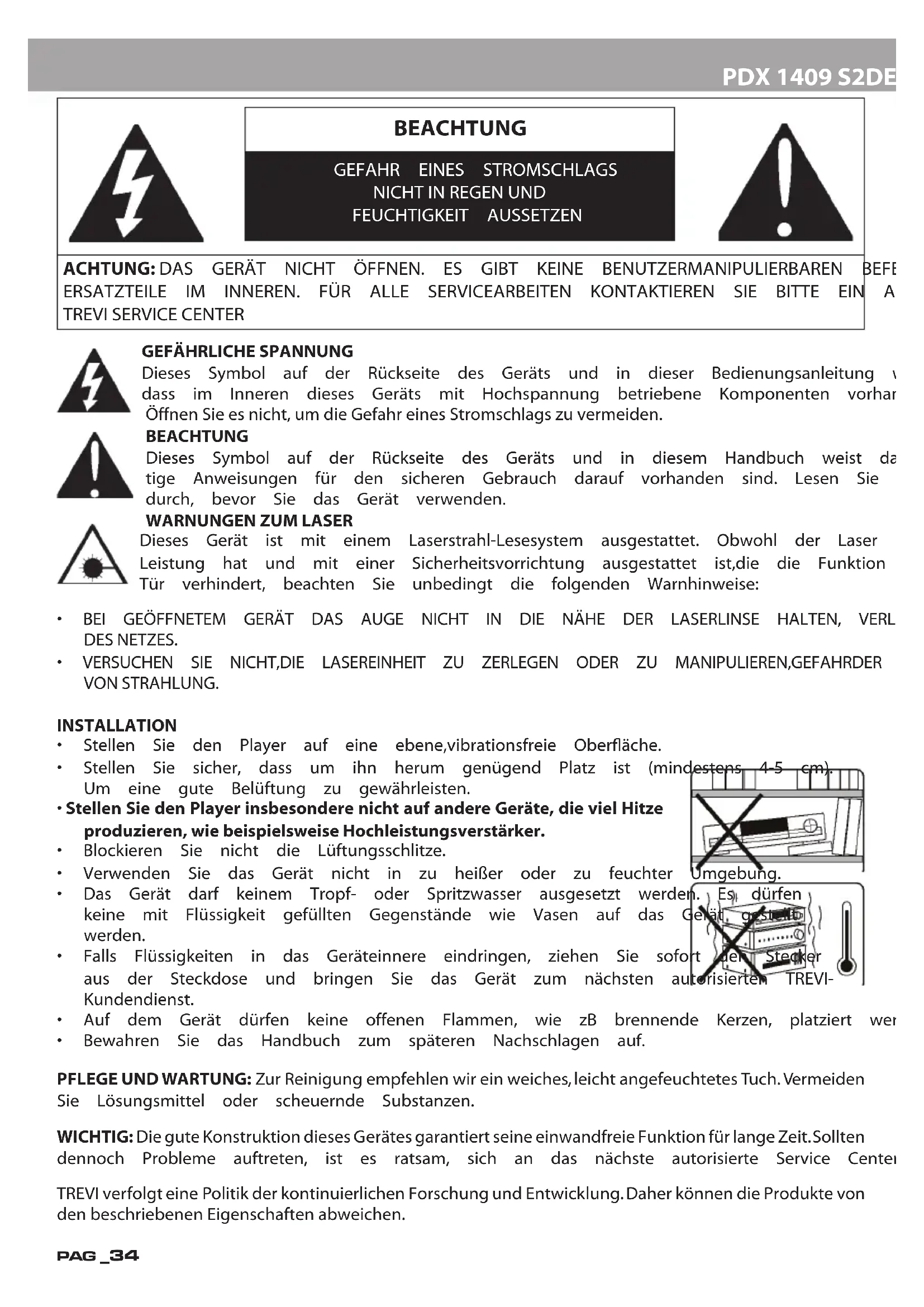 - Bewahren Sie das Handbuch zum späteren Nachschlagen auf. PFLEGE UND WARTUNG: Zur Reinigung empfehlen wir ein weiches, leicht angefeuchtetes Tuch. Vermeiden Sie Lösungsmittel oder scheuernde Substanzen. WICHTIG: Die gute Konstruktion dieses Gerätes garantiert seine einwandfreie Funktion für lange Zeit.Sollten dennoch Probleme auftreten, ist es ratsam, sich an das nächste autorisierte Service Center zu wenden. TREVI verfolgt eine Politik der kontinuierlichen Forschung und Entwicklung.Daher können die Produkte von den beschriebenen Eigenschaften abweichen.PDX 1409 S2 PAG _35 DEUTSCH PRODUKTBESCHREIBUNG