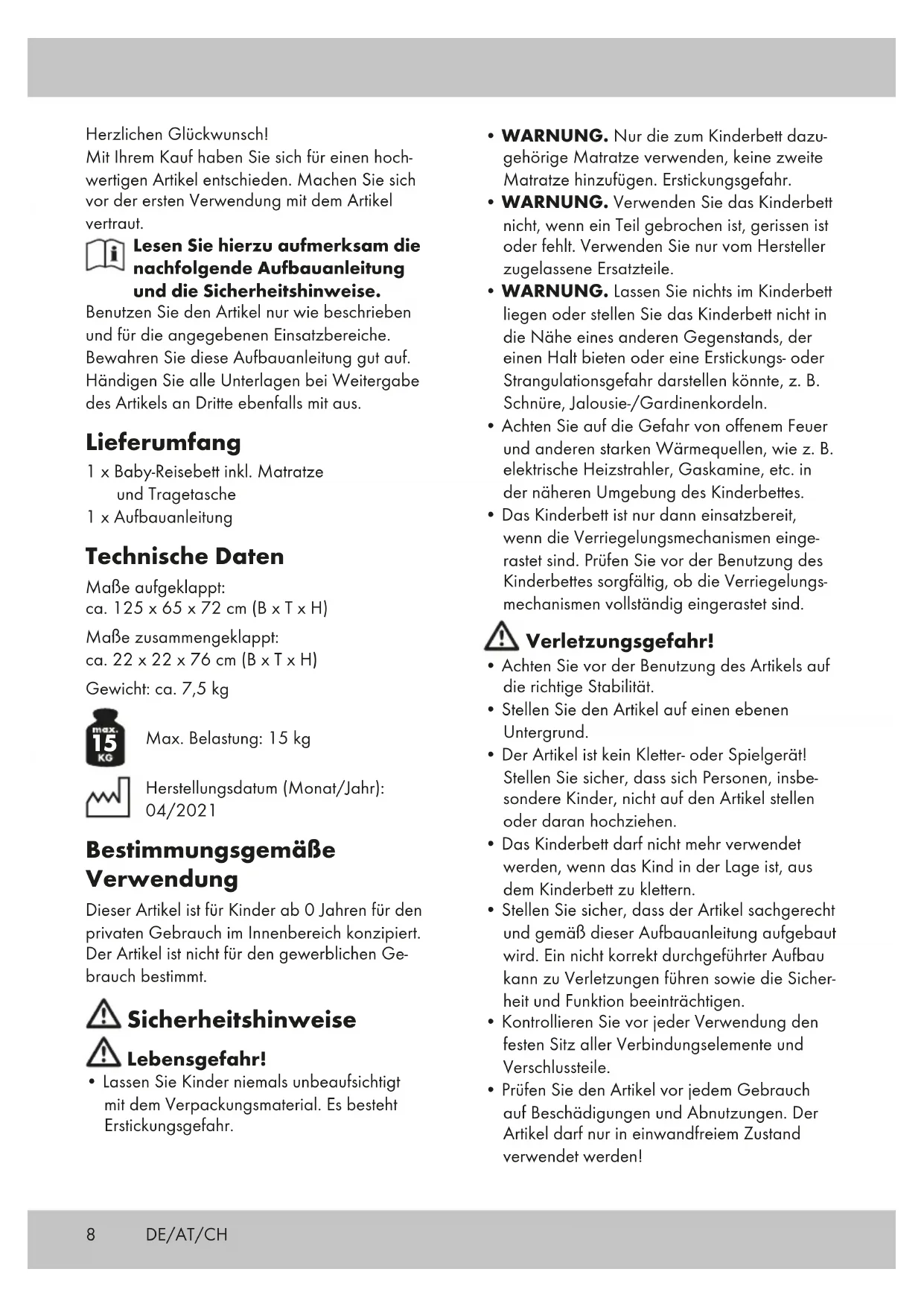 Max. Belastung: 15 kg Herstellungsdatum (Monat/Jahr): 04/2021 Bestimmungsgemäße Verwendung Dieser Artikel ist für Kinder ab 0 Jahren für den privaten Gebrauch im Innenbereich konzipiert. Der Artikel ist nicht für den gewerblichen Ge- brauch bestimmt. Sicherheitshinweise Lebensgefahr!