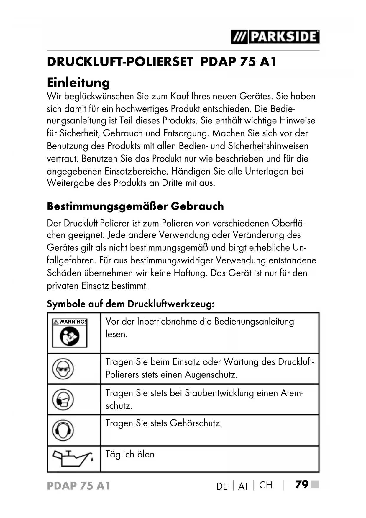 Einleitung Wir beglückwünschen Sie zum Kauf Ihres neuen Gerätes. Sie haben sich damit für ein hochwertiges Produkt entschieden. Die Bedie- nungsanleitung ist Teil dieses Produkts. Sie enthält wichtige Hinweise für Sicherheit, Gebrauch und Entsorgung. Machen Sie sich vor der Benutzung des Produkts mit allen Bedien- und Sicherheitshinweisen vertraut. Benutzen Sie das Produkt nur wie beschrieben und für die angegebenen Einsatzbereiche. Händigen Sie alle Unterlagen bei Weitergabe des Produkts an Dritte mit aus. Bestimmungsgemäßer Gebrauch Der Druckluft-Polierer ist zum Polieren von verschiedenen Oberflä- chen geeignet. Jede andere Verwendung oder Veränderung des Gerätes gilt als nicht bestimmungsgemäß und birgt erhebliche Un- fallgefahren. Für aus bestimmungswidriger Verwendung entstandene Schäden übernehmen wir keine Haftung. Das Gerät ist nur für den privaten Einsatz bestimmt. Symbole auf dem Druckluftwerkzeug: WARNING! Vor der Inbetriebnahme die Bedienungsanleitung lesen. Tragen Sie beim Einsatz oder Wartung des Druckluft- Polierers stets einen Augenschutz. Tragen Sie stets bei Staubentwicklung einen Atem- schutz. Tragen Sie stets Gehörschutz. Täglich ölenPDAP 75 A1 ■ 80