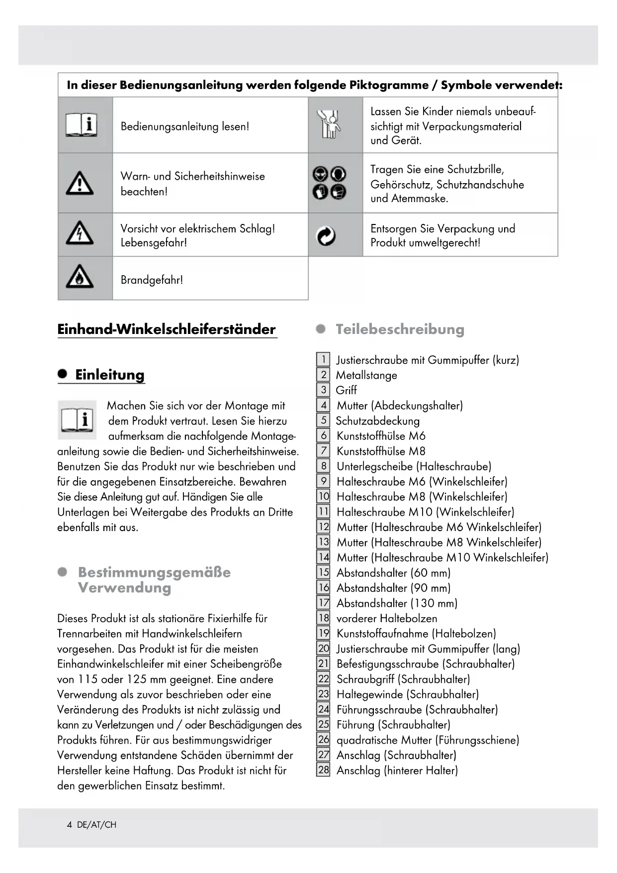 SLIJPER Montage-, bedienings- en veiligheidsinstructies EINHAND-WINKELSCHLEIFERSTÄNDERDE / AT / CH Montage-, Bedienungs- und Sicherheitshinweise Seite 3 FR /CH Instructions de montage, d‘utilisation et consignes de sécurité Page 9 IT/ CH Istruzioni di montaggio, d’uso e di sicurezza Pagina 15 NL Montage-, bedienings- en veiligheidsinstructies Pagina 213 DE/AT/CH Einleitung Bestimmungsgemäße Verwendung ...................................................................................................Seite 4 Teilebeschreibung ...............................................................................................................................Seite 4 Lieferumfang .......................................................................................................................................Seite 5 Technische Daten ................................................................................................................................Seite 5 Sicherheitshinweise ............................................................................................................... Seite 5 Allgemeine Sicherheitshinweise ........................................................................................................Seite 6 Montage ..........................................................................................................................................Seite 7 Bedienung ...................................................................................................................................... Seite 8 Reinigung und Pflege ........................................................................................................... Seite 8 Entsorgung ....................................................................................................................................Seite 84 DE/AT/CH In dieser Bedienungsanleitung werden folgende Piktogramme / Symbole verwendet: Bedienungsanleitung lesen! Lassen Sie Kinder niemals unbeauf- sichtigt mit Verpackungsmaterial und Gerät. Warn- und Sicherheitshinweise beachten! Tragen Sie eine Schutzbrille, Gehörschutz, Schutzhandschuhe und Atemmaske. Vorsicht vor elektrischem Schlag! Lebensgefahr! Entsorgen Sie Verpackung und Produkt umweltgerecht! Brandgefahr! Einhand-Winkelschleiferständer Einleitung Machen Sie sich vor der Montage mit dem Produkt vertraut. Lesen Sie hierzu aufmerksam die nachfolgende Montage- anleitung sowie die Bedien- und Sicherheitshinweise. Benutzen Sie das Produkt nur wie beschrieben und für die angegebenen Einsatzbereiche. Bewahren Sie diese Anleitung gut auf. Händigen Sie alle Unterlagen bei Weitergabe des Produkts an Dritte ebenfalls mit aus. Bestimmungsgemäße Verwendung Dieses Produkt ist als stationäre Fixierhilfe für Trennarbeiten mit Handwinkelschleifern vorgesehen. Das Produkt ist für die meisten Einhandwinkelschleifer mit einer Scheibengröße von 115 oder 125 mm geeignet. Eine andere Verwendung als zuvor beschrieben oder eine Veränderung des Produkts ist nicht zulässig und kann zu Verletzungen und / oder Beschädigungen des Produkts führen. Für aus bestimmungswidriger Verwendung entstandene Schäden übernimmt der Hersteller keine Haftung. Das Produkt ist nicht für den gewerblichen Einsatz bestimmt. Teilebeschreibung