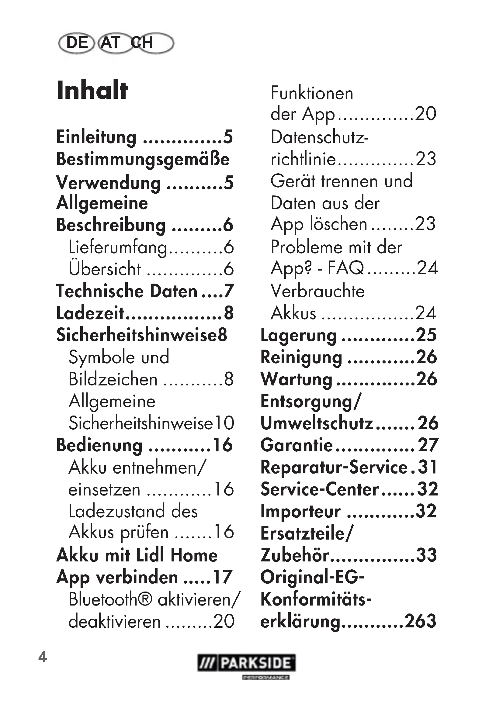 - Ersatzteile/ Zubehör DE AT CH Einleitung Herzlichen Glück- wunsch zum Kauf Ihres neuen Gerätes. Sie ha- ben sich damit für ein hochwertiges Produkt entschieden. Dieses Gerät wurde während der Produktion auf Qualität geprüft und einer Endkont- rolle unterzogen. Die Funktionsfähigkeit Ihres Gerätes ist somit sicher- gestellt. Die Betriebsanlei- tung ist Bestandteil dieses Produkts. Sie ent- hält wichtige Hinweise für Sicherheit, Ge- brauch und Entsor- gung. Machen Sie sich vor der Benutzung des Produkts mit allen Bedi- en- und Sicherheitshin- weisen vertraut. Benut- zen Sie das Produkt nur wie beschrieben und für die angegebenen Ein- satzbereiche. Bewahren Sie die Anleitung gut auf und händigen Sie alle Unterlagen bei Weitergabe des Pro- dukts an Dritte mit aus. Bestimmungs- gemäße Verwendung Der Akku ist kompatibel zu allen Geräten des PARKSIDE X20VTeams. Die Akkus dürfen nur mit Ladegeräten der Serie Parkside X20VTEAM geladen werden. Jede andere Verwendung6 DE AT CH kann zu Schäden am Gerät führen und eine ernsthafte Gefahr für den Benutzer darstellen. Dieses Gerät ist nicht zur gewerblichen Nutzung geeignet. Bei gewerb- lichem Einsatz erlischt die Garantie. Der Hersteller haftet nicht für Schäden, die durch bestimmungswidrigen Gebrauch oder falsche Bedienung verursacht wurden. Allgemeine Beschreibung Die Abbil- dungen n- den Sie auf der vorde- ren Ausklappseite. Lieferumfang - Akku - Betriebsanleitung Das Ladegerät ist nicht im Lieferumfang enthalten. Entsorgen Sie das Verpackungsmaterial ordnungsgemäß. Übersicht 1 Entriegelungstaste 2 Taste zur Ladezustands- anzeige 3 Ladezustands- anzeige 4 Akku7 DE AT CH Technische Daten Akku (Li-Ion) p. 335